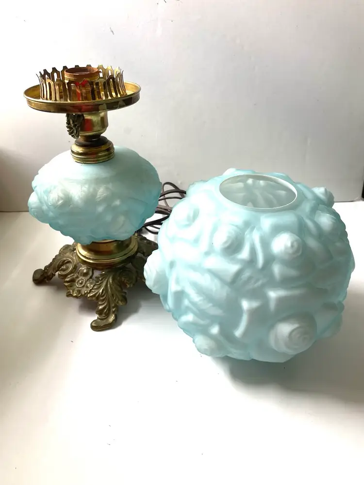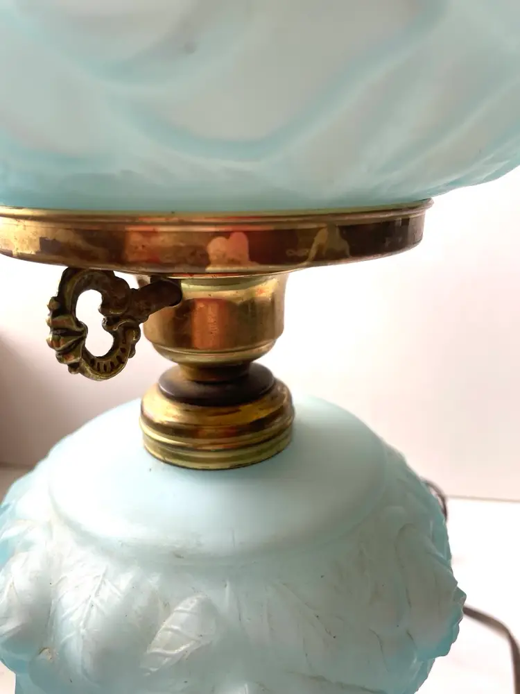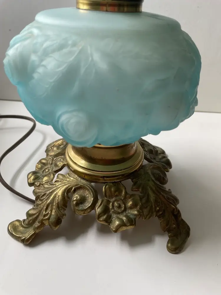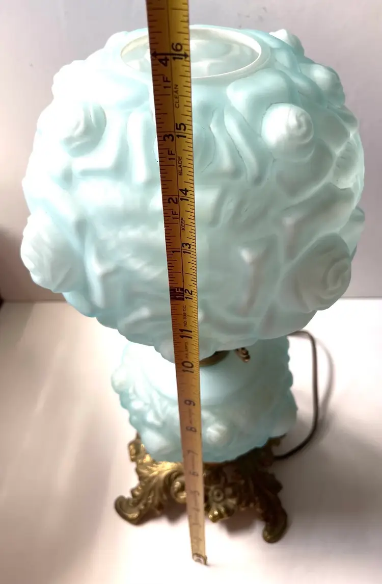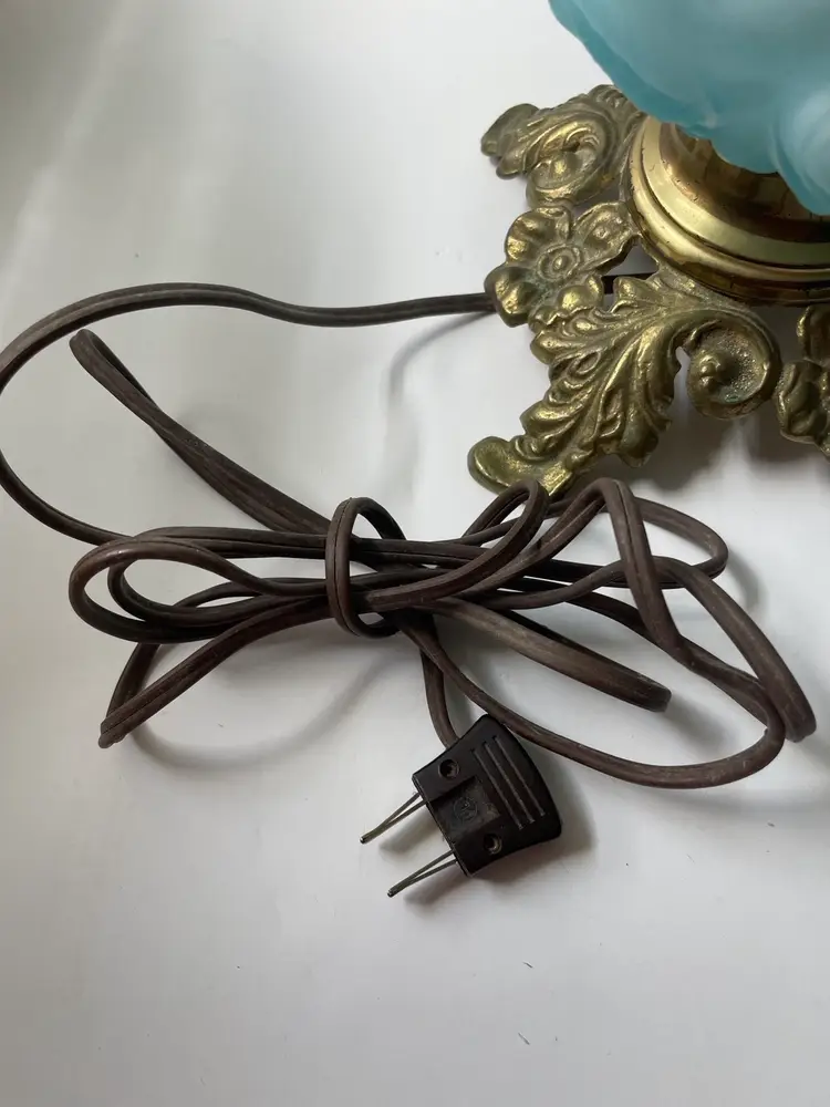 Lovely vintage condition. Some scuffs on inside of the shade base that does not affect the use or beauty of this vintage lamp I show this in photo #8. There is something making a noise in base when handling the lamp that I do not know what it is. Metal shows patina and wear as shown in photos. The cord is vintage and needs to be replaced before use. A beautiful vintage find. (I love the blue color). As always, thank you for visiting my store! :)