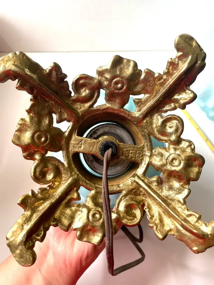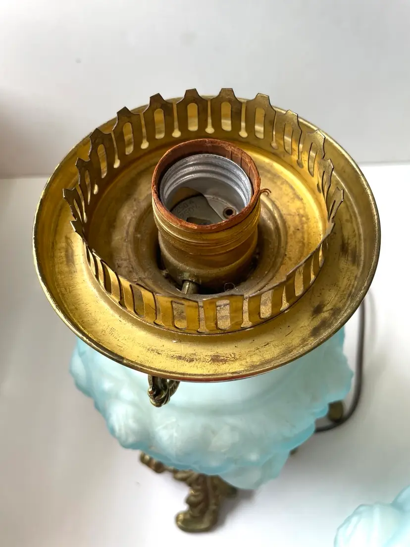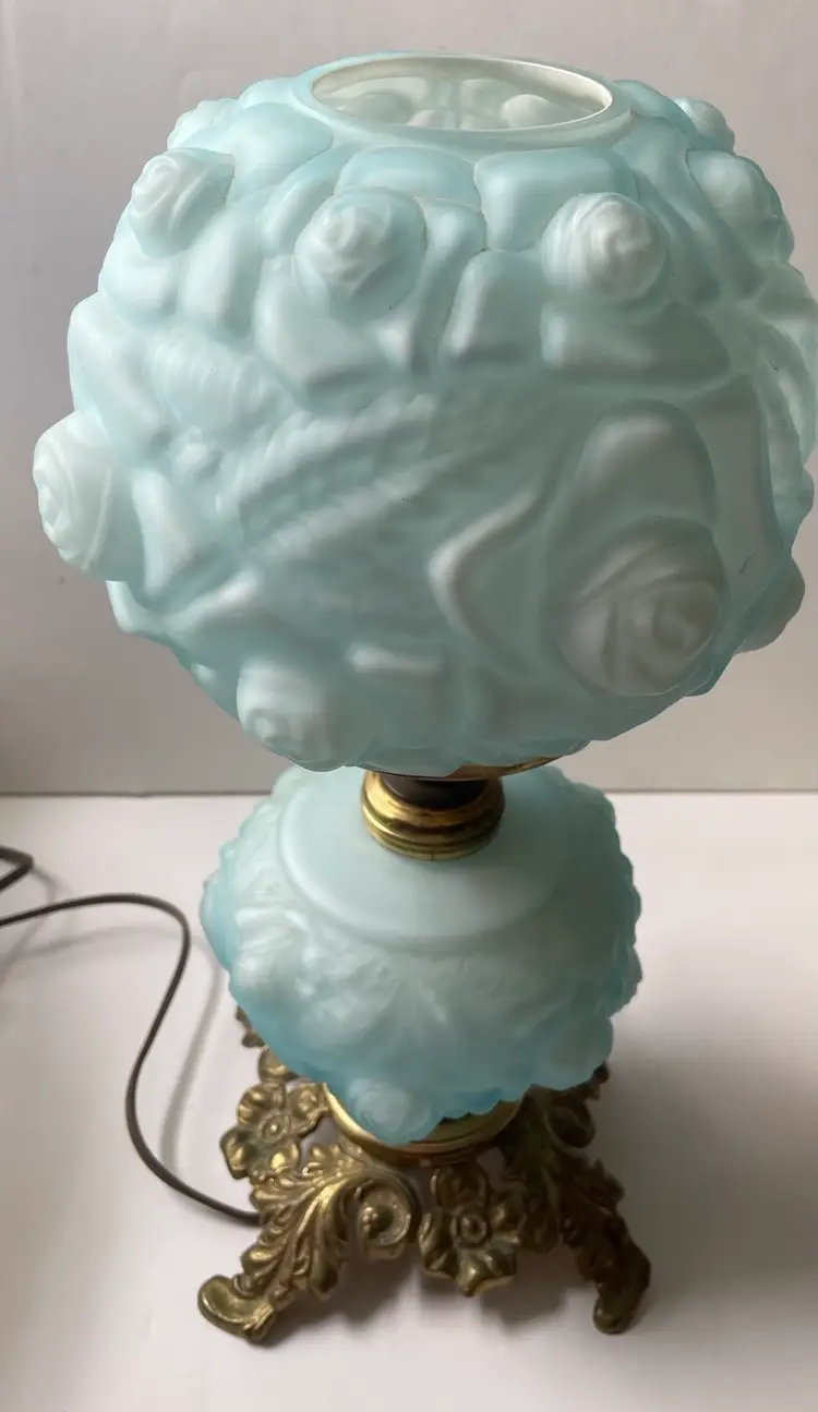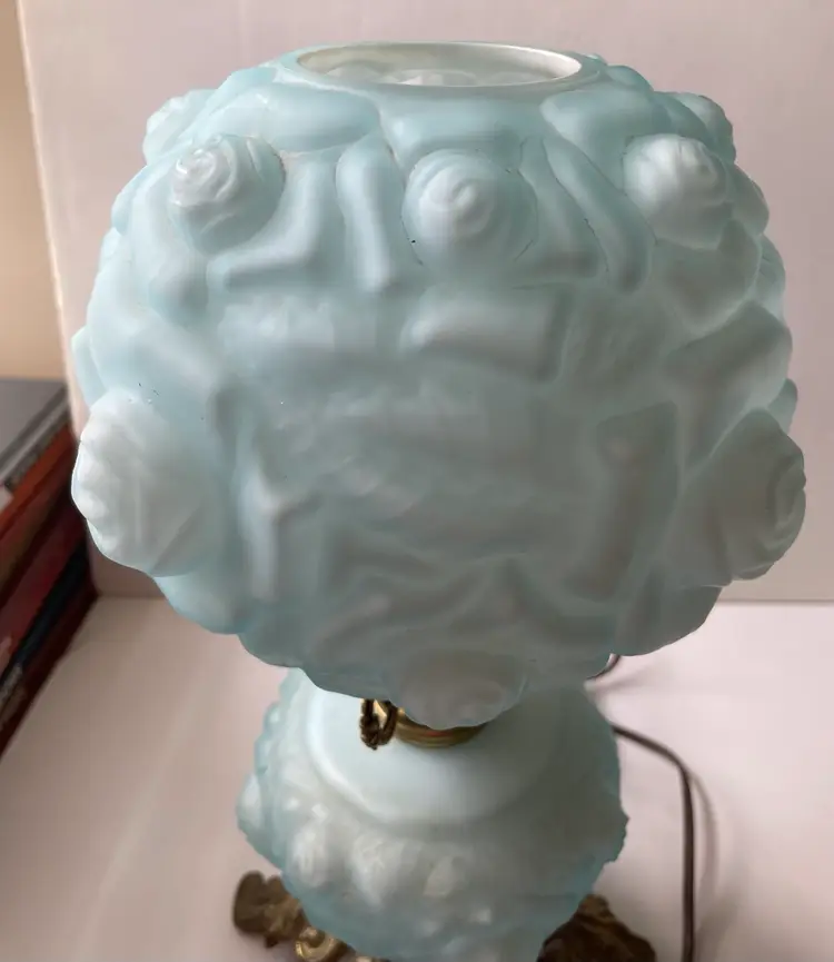 Lovely vintage condition. Some scuffs on inside of the shade base that does not affect the use or beauty of this vintage lamp I show this in photo #8. There is something making a noise in base when handling the lamp that I do not know what it is. Metal shows patina and wear as shown in photos. The cord is vintage and needs to be replaced before use. A beautiful vintage find. (I love the blue color). As always, thank you for visiting my store! :)