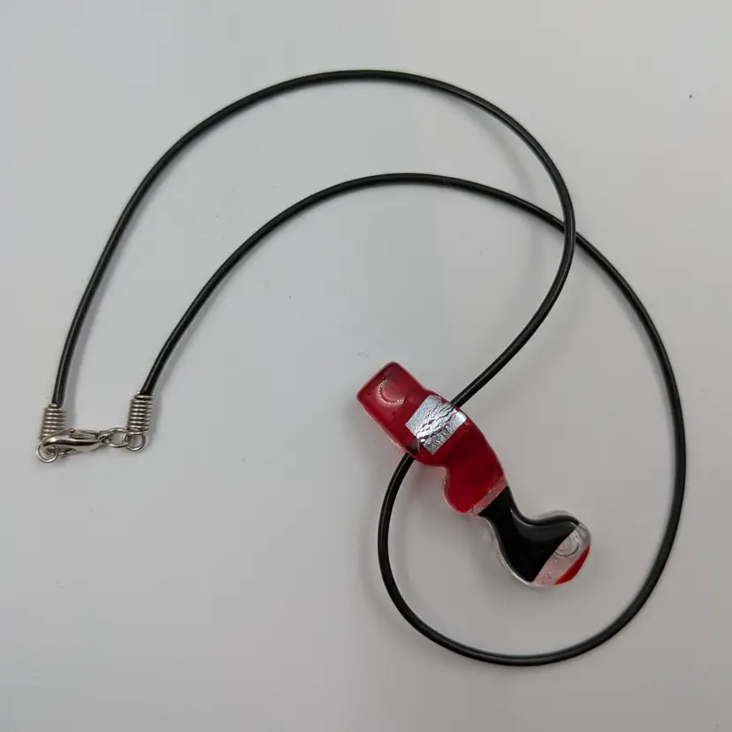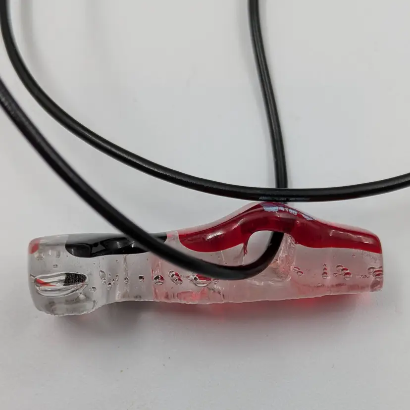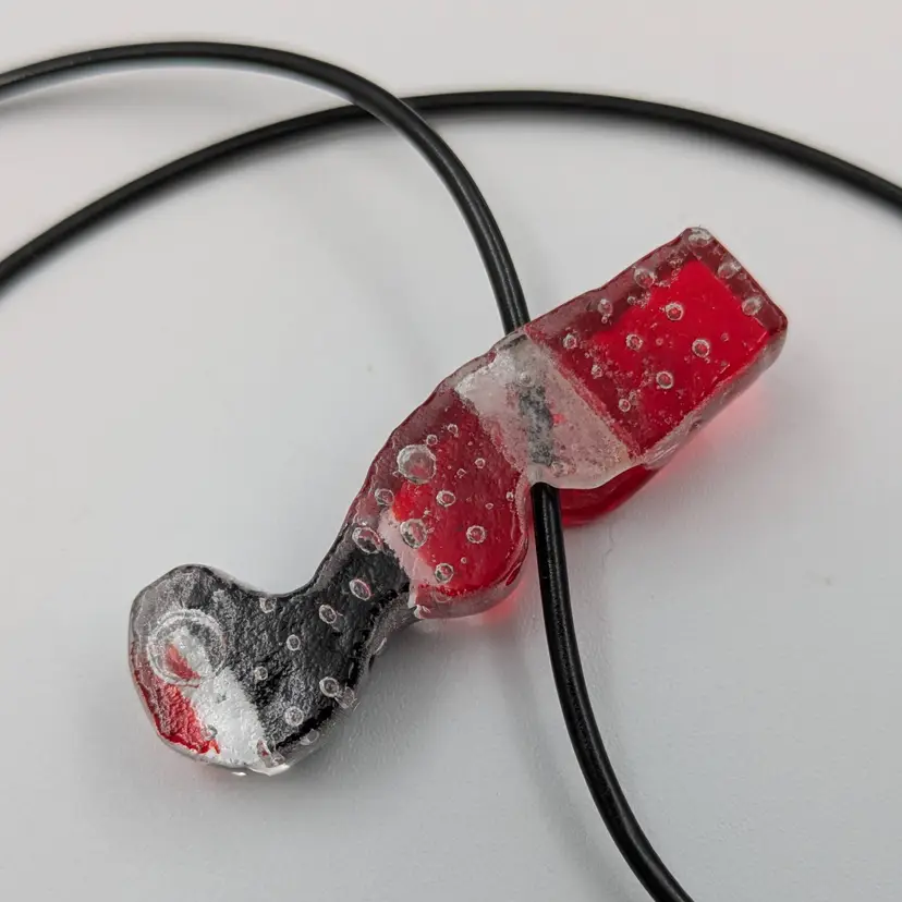 Very interesting fused glass pendant in clear bubbled glass with red, black and silver details. Comes on a rubber cord. Unsigned. No chips or cracks.