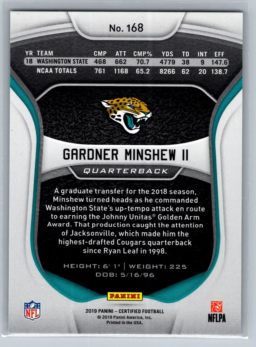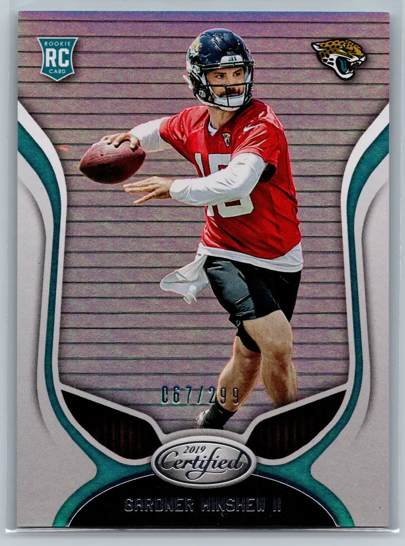 A sharp, low-numbered Rookie Card of Quarterback Gardner Minshew II from the 2019 Panini Certified Football set! This card is a Mirror Parallel with a print run of only 299 copies.