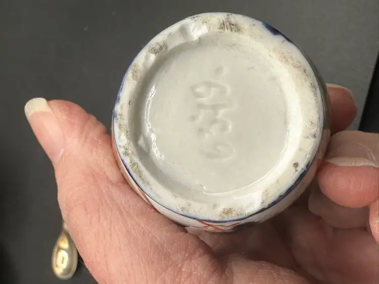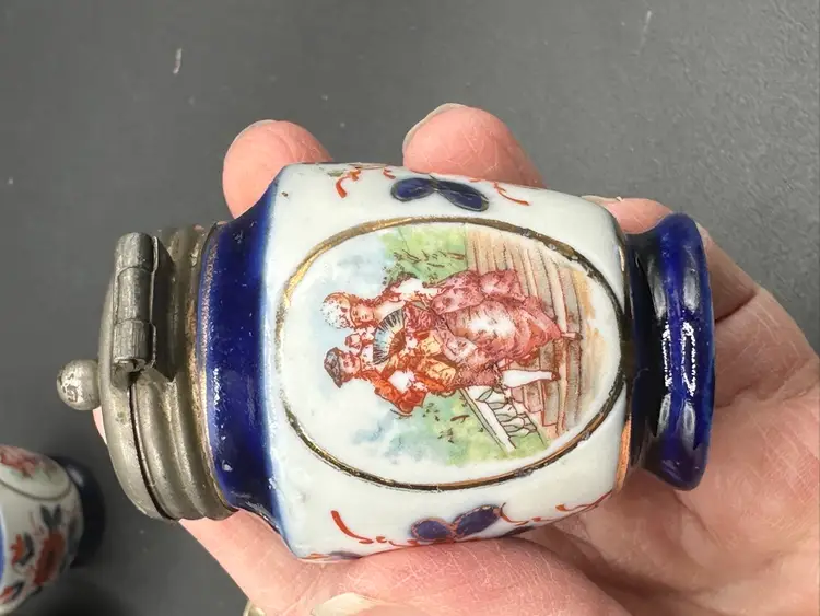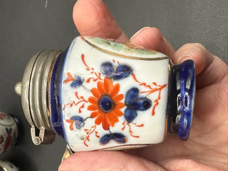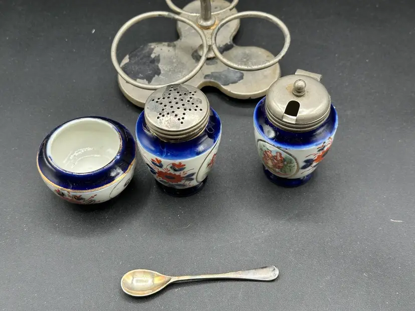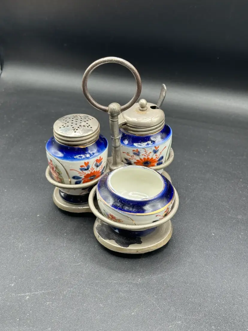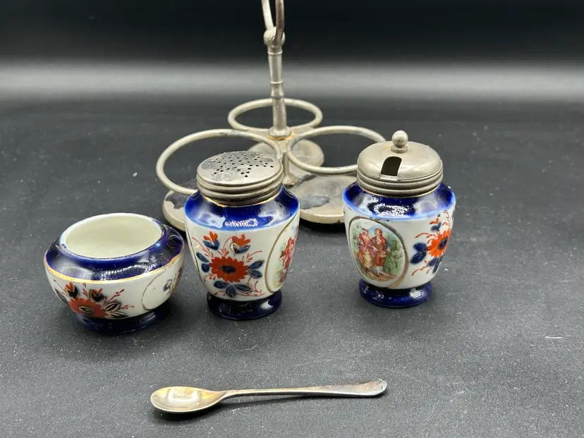 GAUDY WELSH / FLOW BLUE / CONDITMENT SET IN EPNS SILVER HOLDER