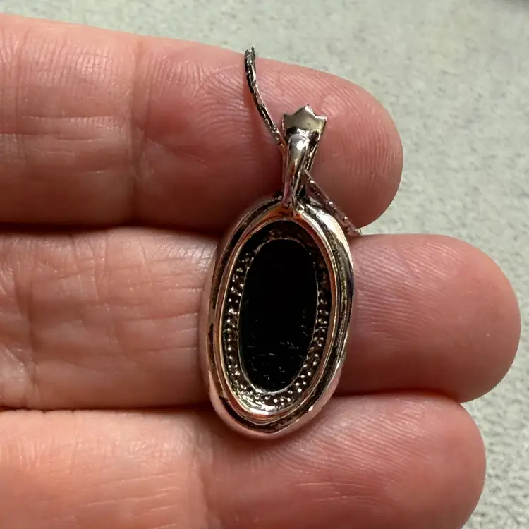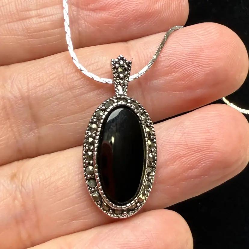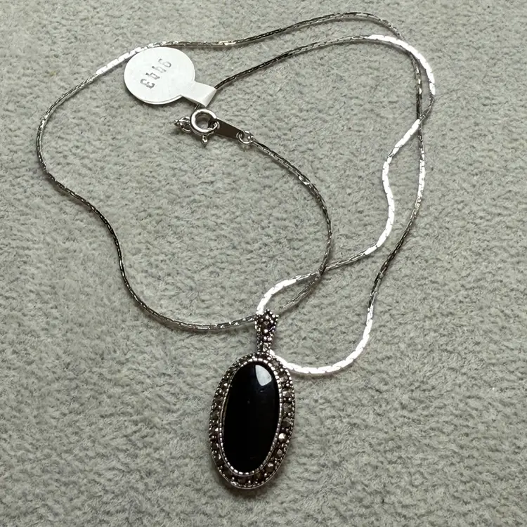 Genuine Onyx & Marcasite 18" Oval Pendant Necklace 18Kt HGE Silver Tone NW. NEW Made in USA. Pendant is about 1.25" long. 18-karat heavy gold electroplate.