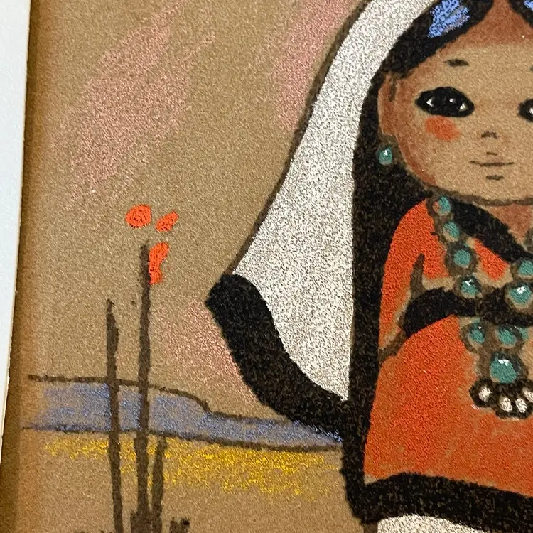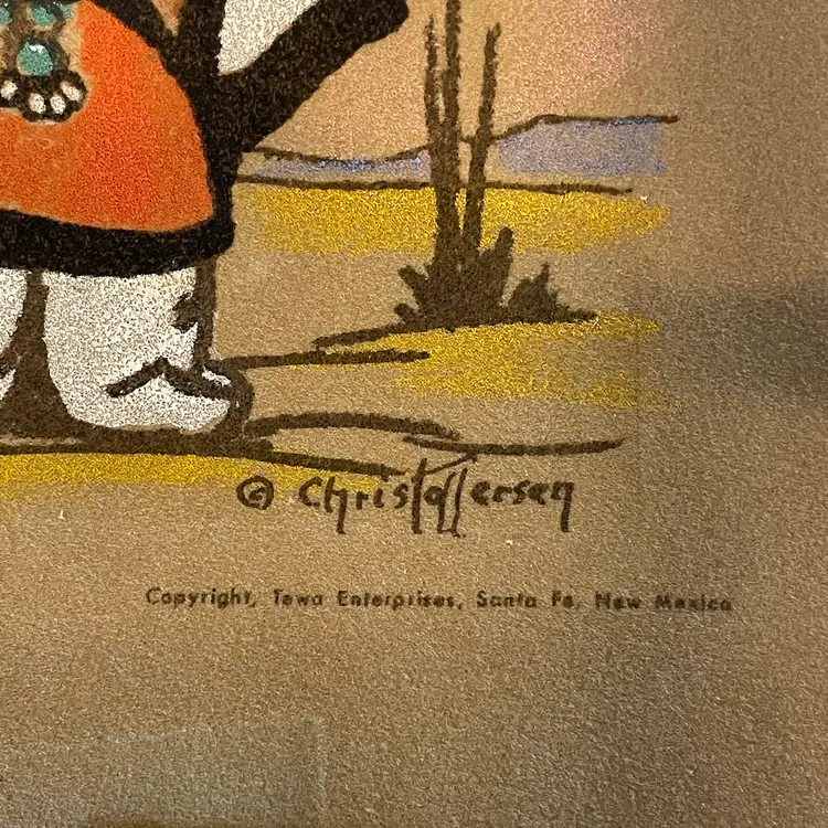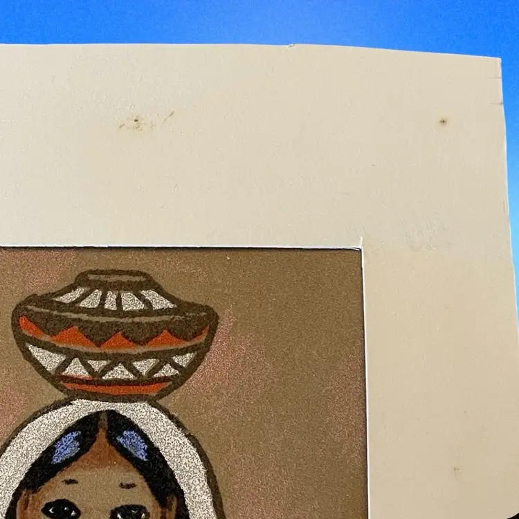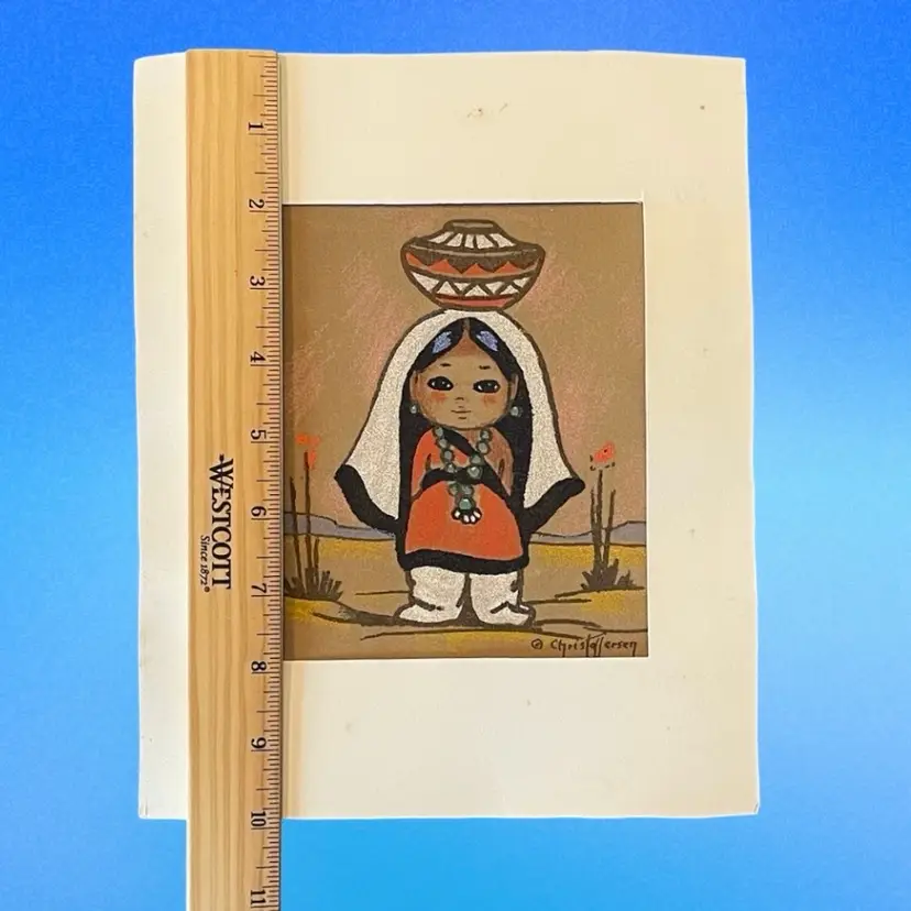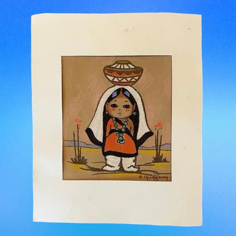 This is a vintage Gerda Christoffersen matted Oodees serigraph on velvet paper depicting a Native American girl with pottery. Made in Santa Fe, New Mexico. The entire piece including matte measures approximately 10" long x 8" wide. The matte has a few spots of wear as shown in pictures. The screen print has no major flaws. Smoke free home.