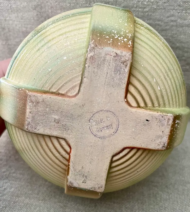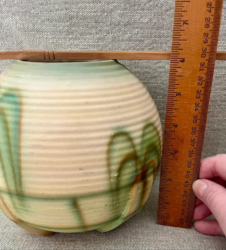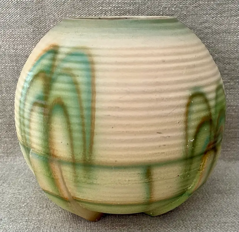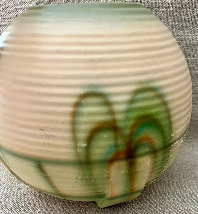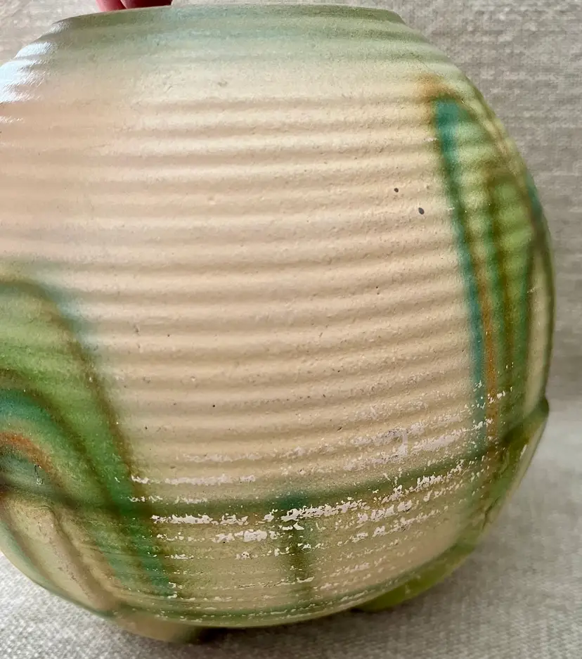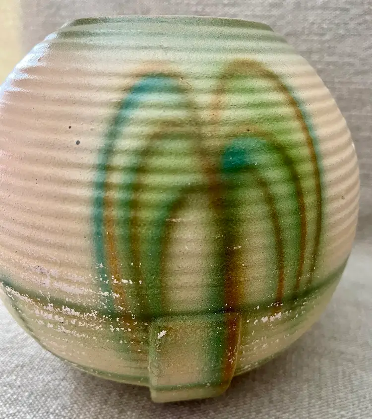 This German Art Deco pottery beehive ball globe vase features streamline moderne curves, a minimalist footed base, and a grooved design with aged glaze. Produced in the early 20th century, this medium-sized vase showcases the Art Deco style popular prior and during the WWII era. Made of pottery with a multicolor finish and a matte glaze, this original piece from Germany is perfect for all occasions and easy to care for. Standing approximately 6 inches tall, this unique and collectible vase is a beautiful addition to any decor.