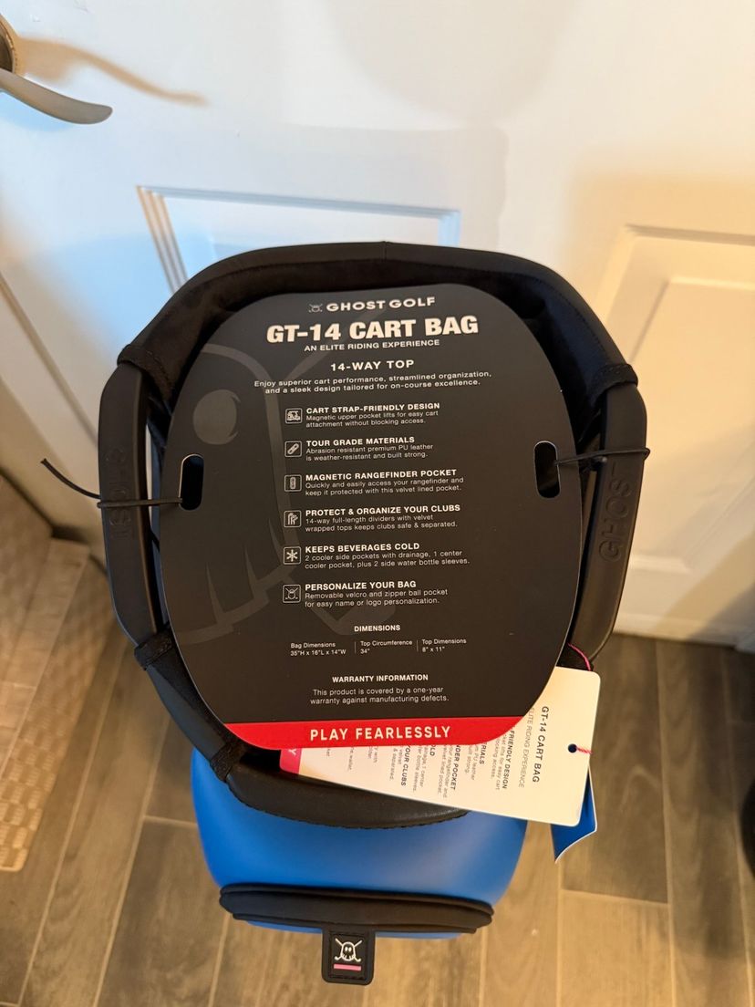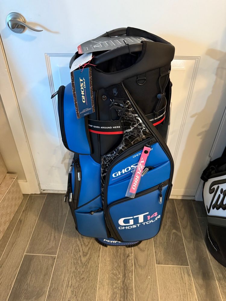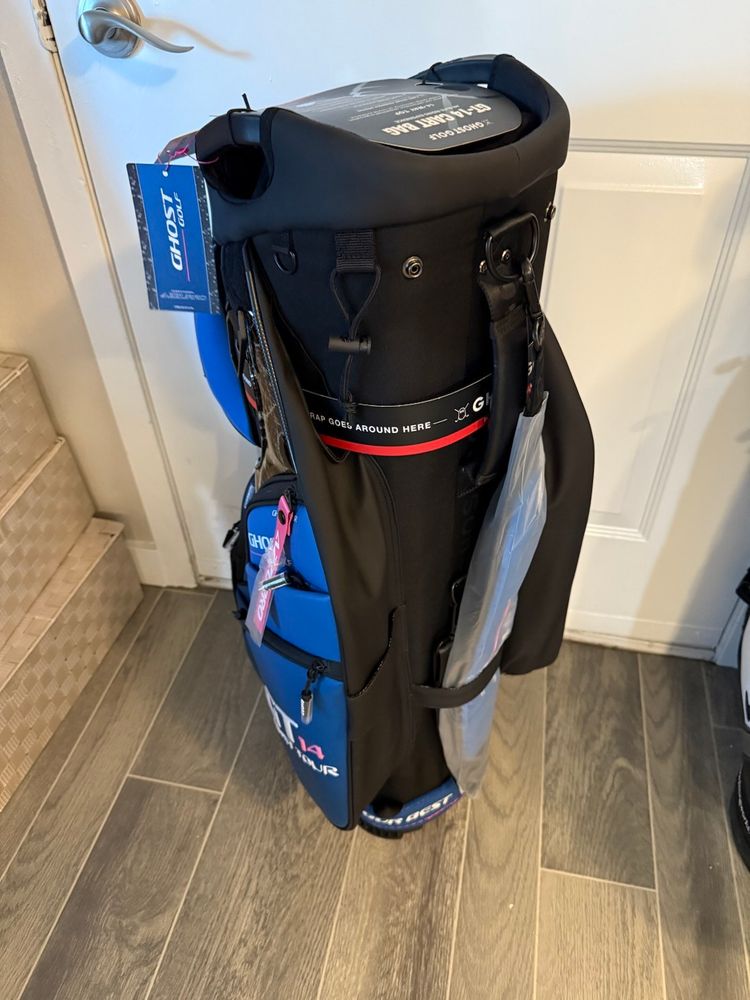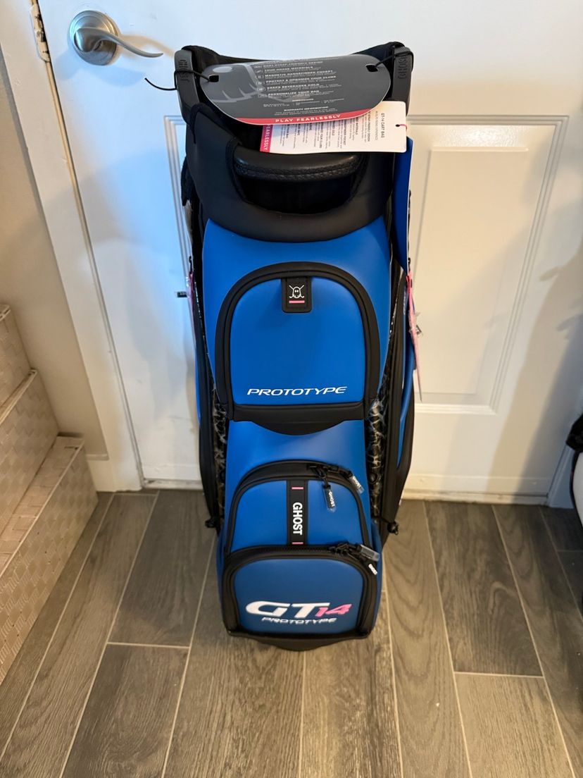 Brand new with tags and accessories. Ghost Golf GT-14 Prototype AZZURO 14-Way Cart Bag - Labeled 001-499 on tag.