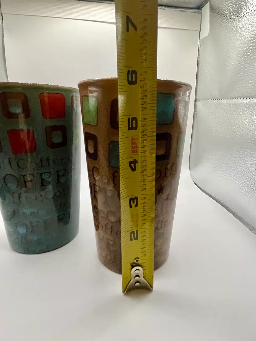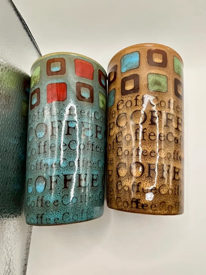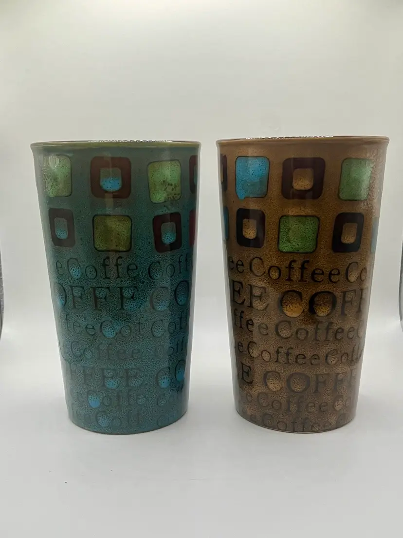 Gibson Ceramic Mr. Coffee 13 Oz Multi Color Tumbler Pair Brown Teal. No Condition Issue. 6”