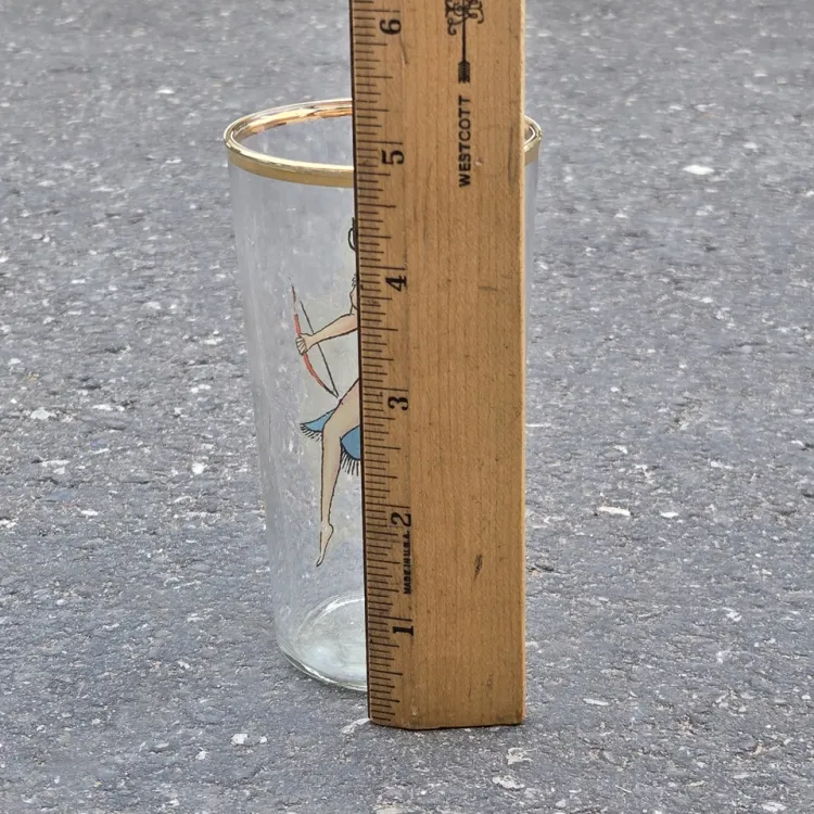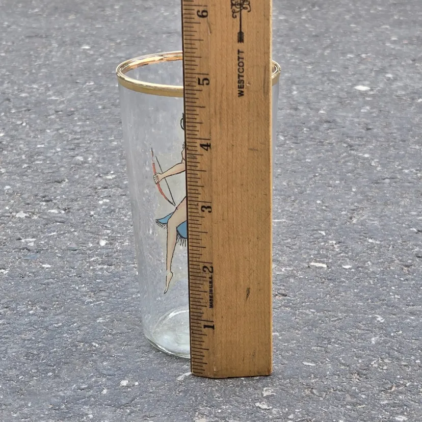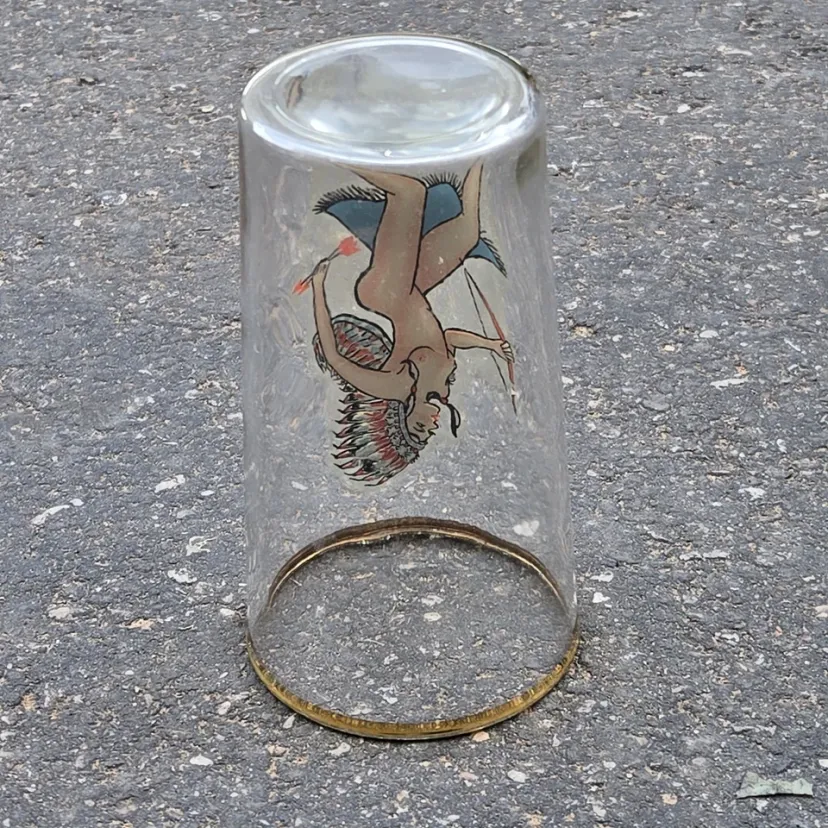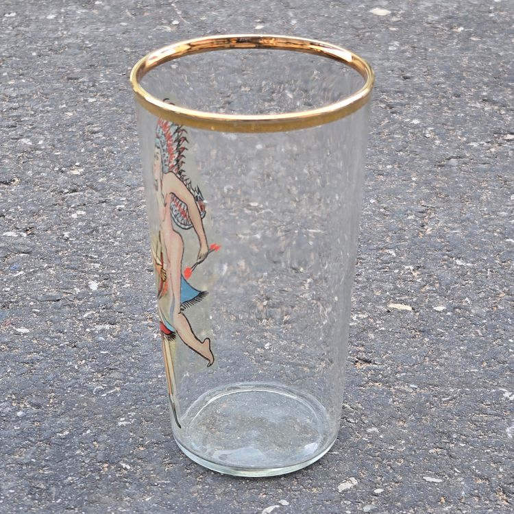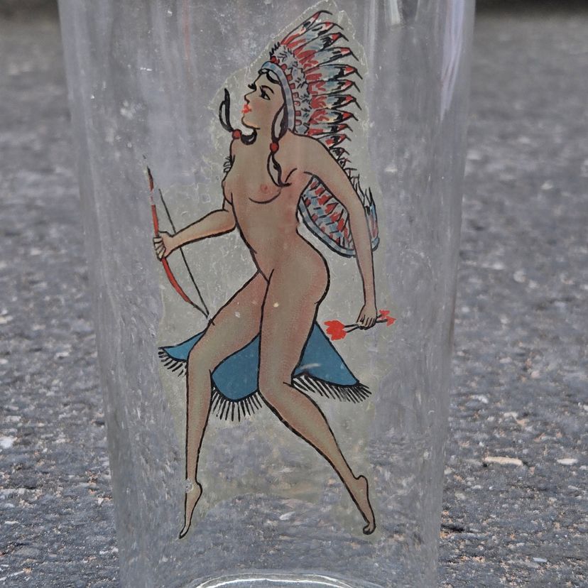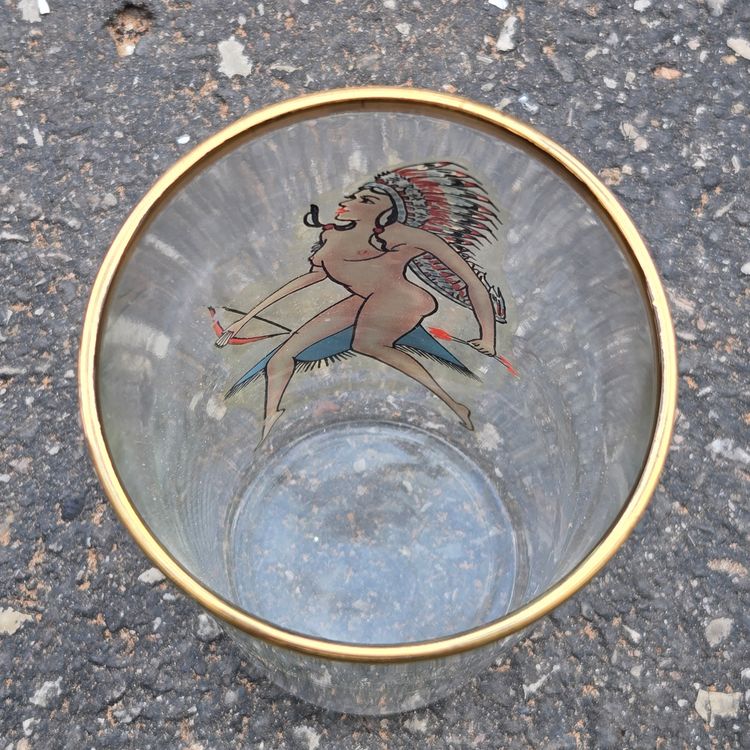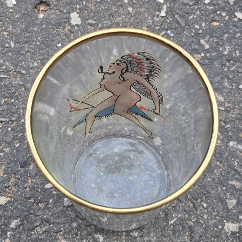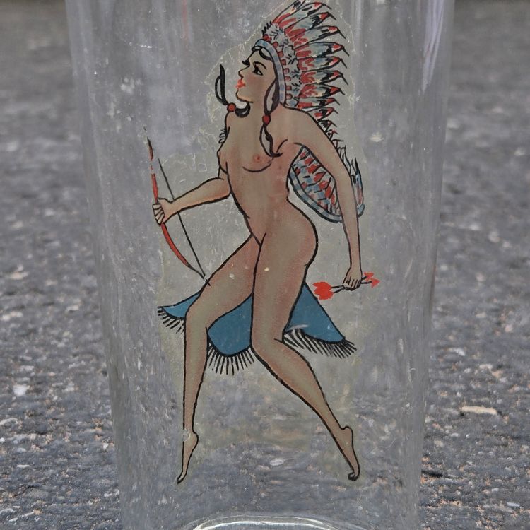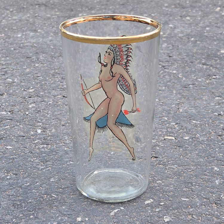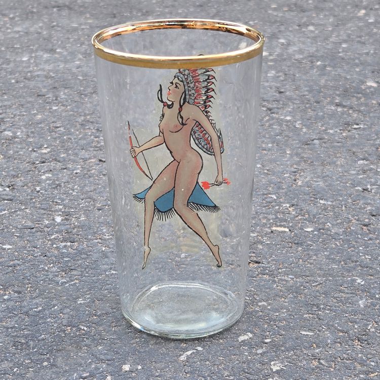 Girlie Nude Bar Glass Novelty Risque 1940’s/50’s MCM 4¾" Tall Vintage with Condition Issues. Used condition with some spots of missing color, thinning on gold, scratches, dust and dirt. Please view all the photos and please ask any questions prior to purchase when possible.