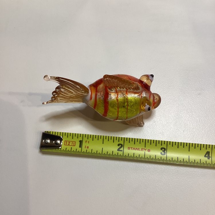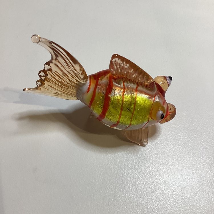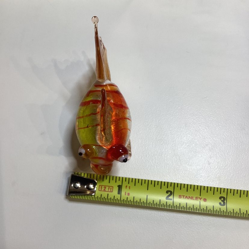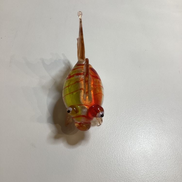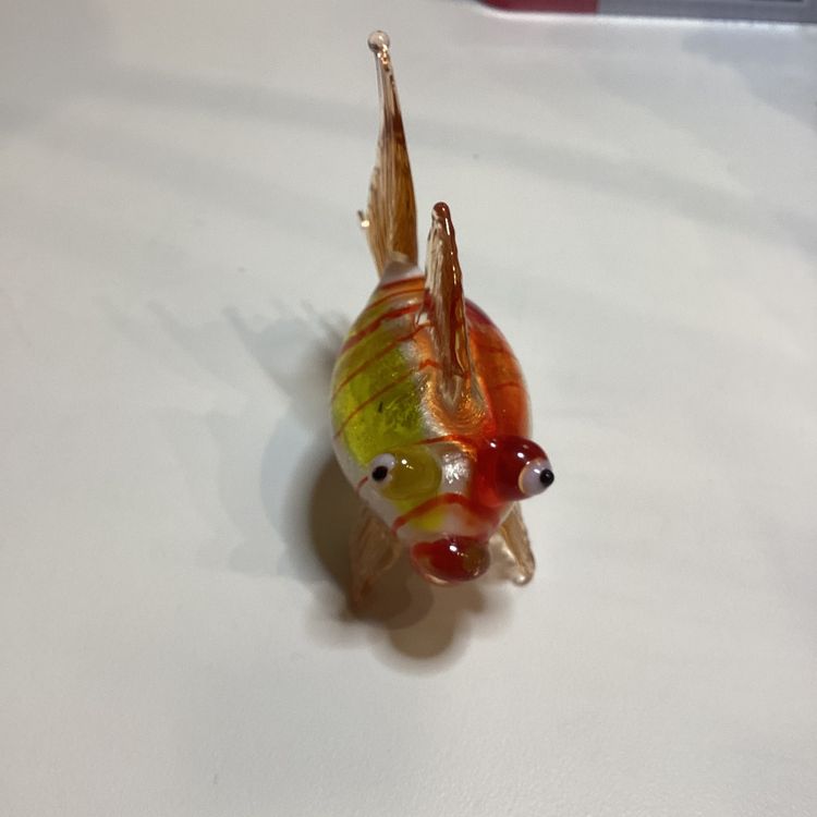 The product is a hand-blown glass fish figurine in vibrant orange, yellow, and white colors, featuring a koi or angelfish or goldfish design (it is unknown). It is a unique and decorative piece of art glass that is handmade without branding or signature. This figurine captures the beauty and elegance of fish with its intricate details and colorful hues, making it a standout addition to any collection of decorative glassware.