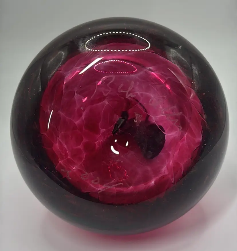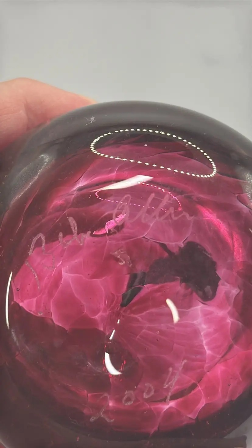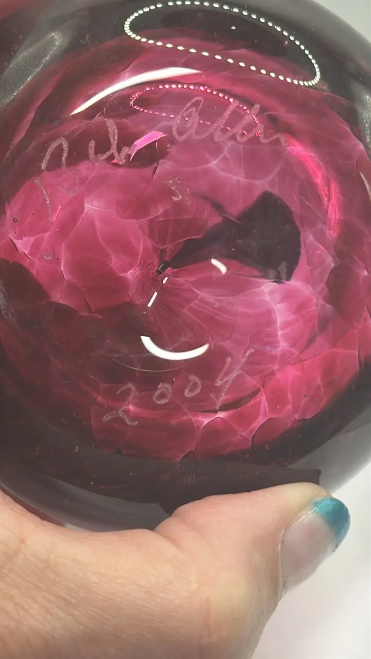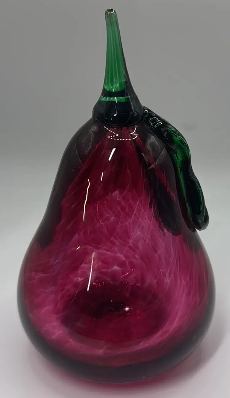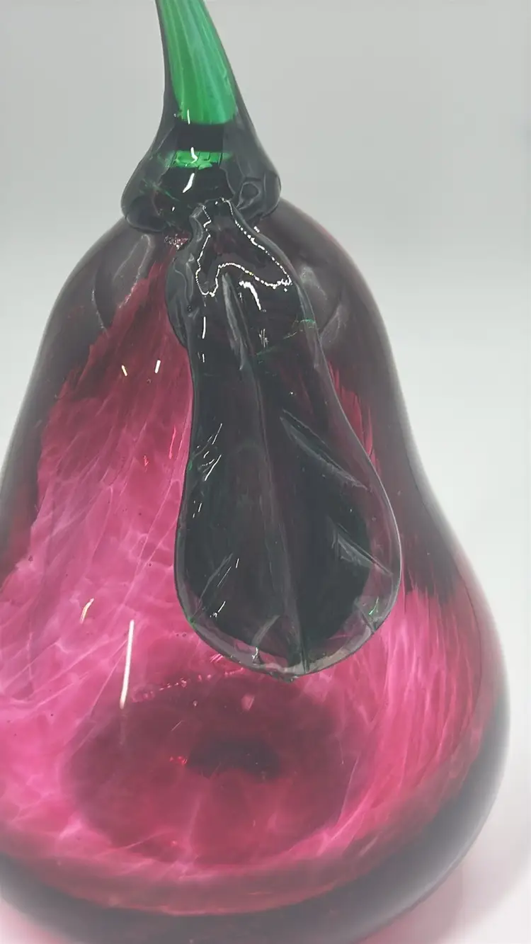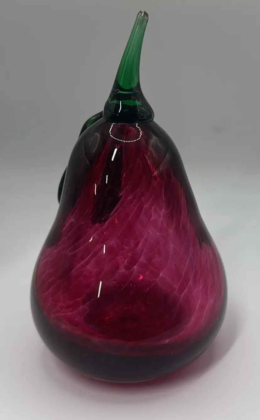 Glass Pear Signed Bob Allen 2004 hand blown Dark Pink and Green 6” tall Bob Allen is a glass blower from West Virginia Beautiful with no breaks or chips Add a touch of elegance to your home with this stunning glass pear sculpture. Featuring a beautiful deep pink burgundy body with a green stem, this piece is perfect for art lovers. (293227258)