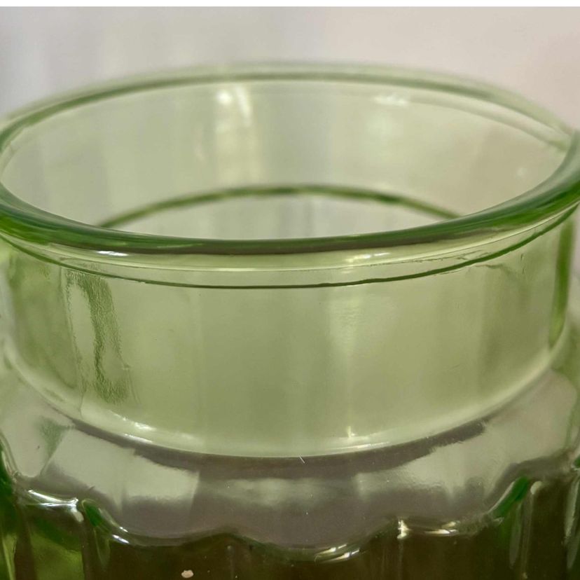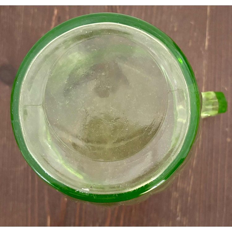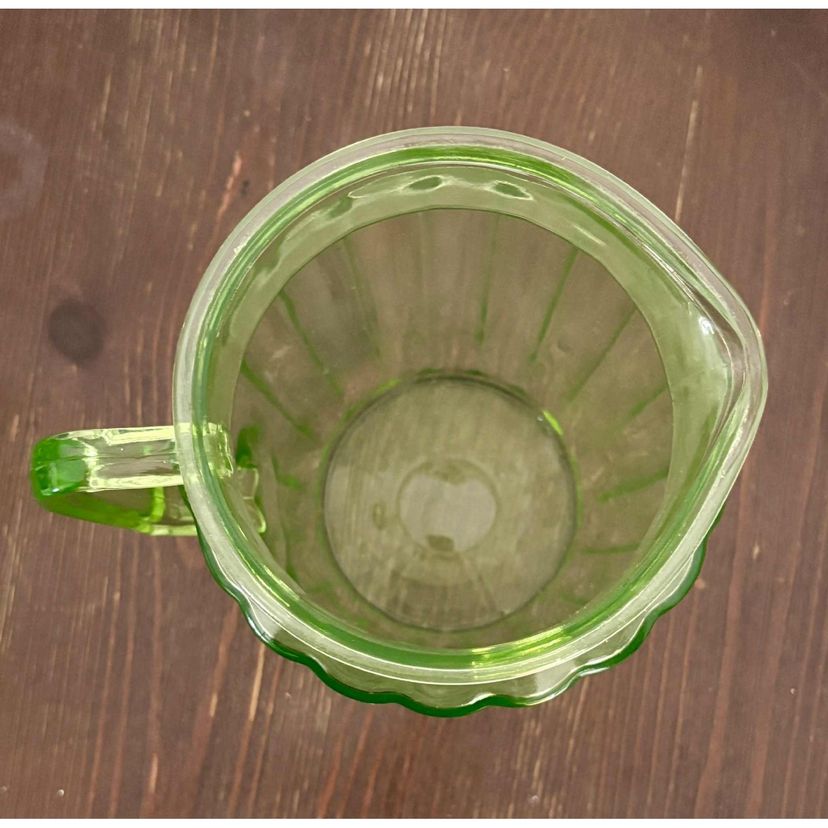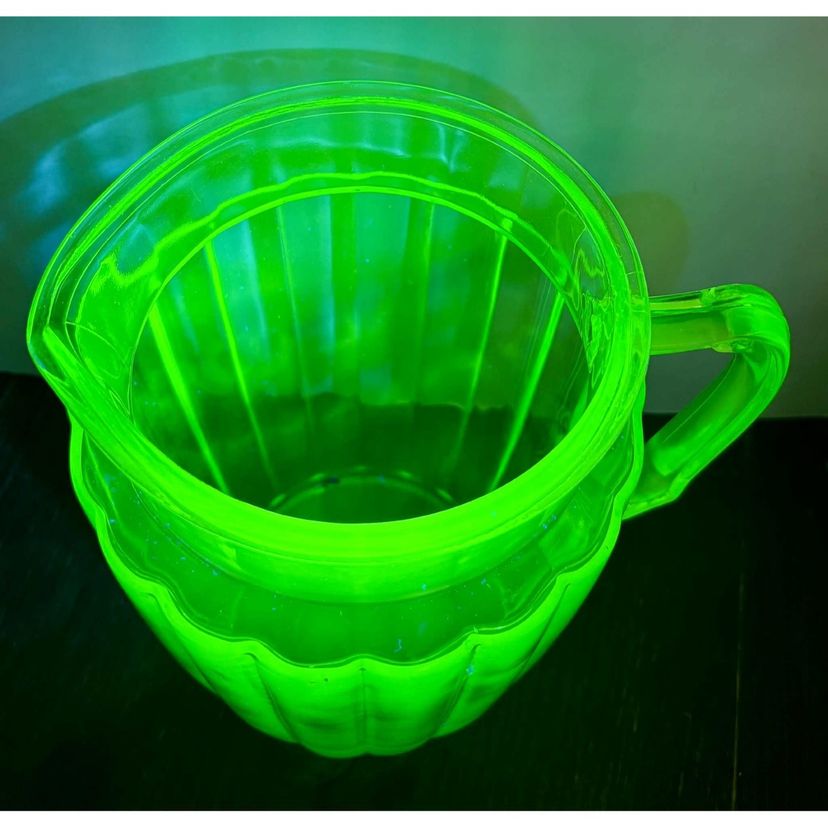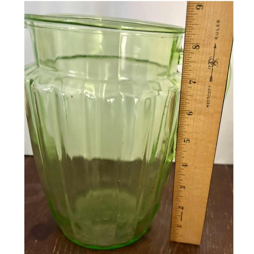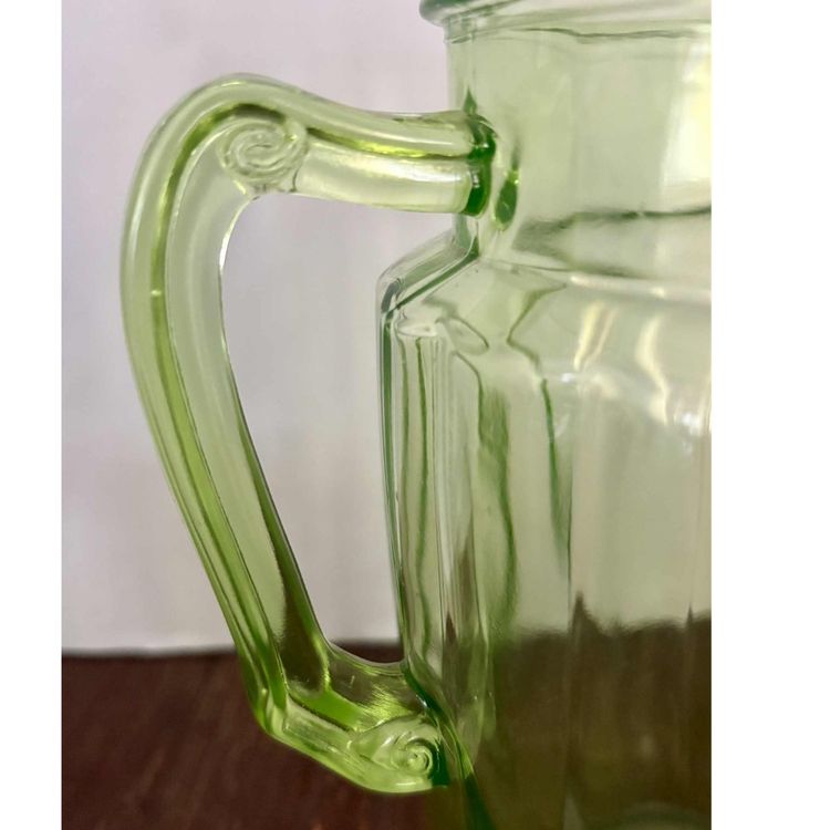 Approx. 8.5” Vintage 1930’s Anchor Hocking green uranium glass pitcher, often referred to as "Depression Glass” Pitcher featuring a ribbed design, was made by the Hocking Glass Co. in the "Pillar Optic" pattern NO CHIPS or CRACKS In excellent condition!
