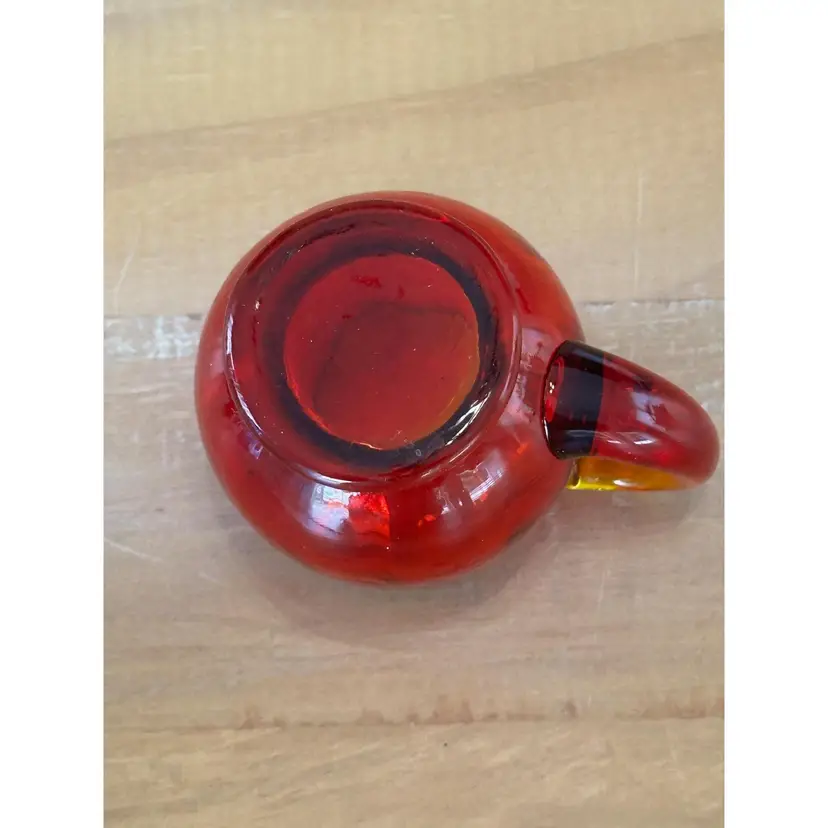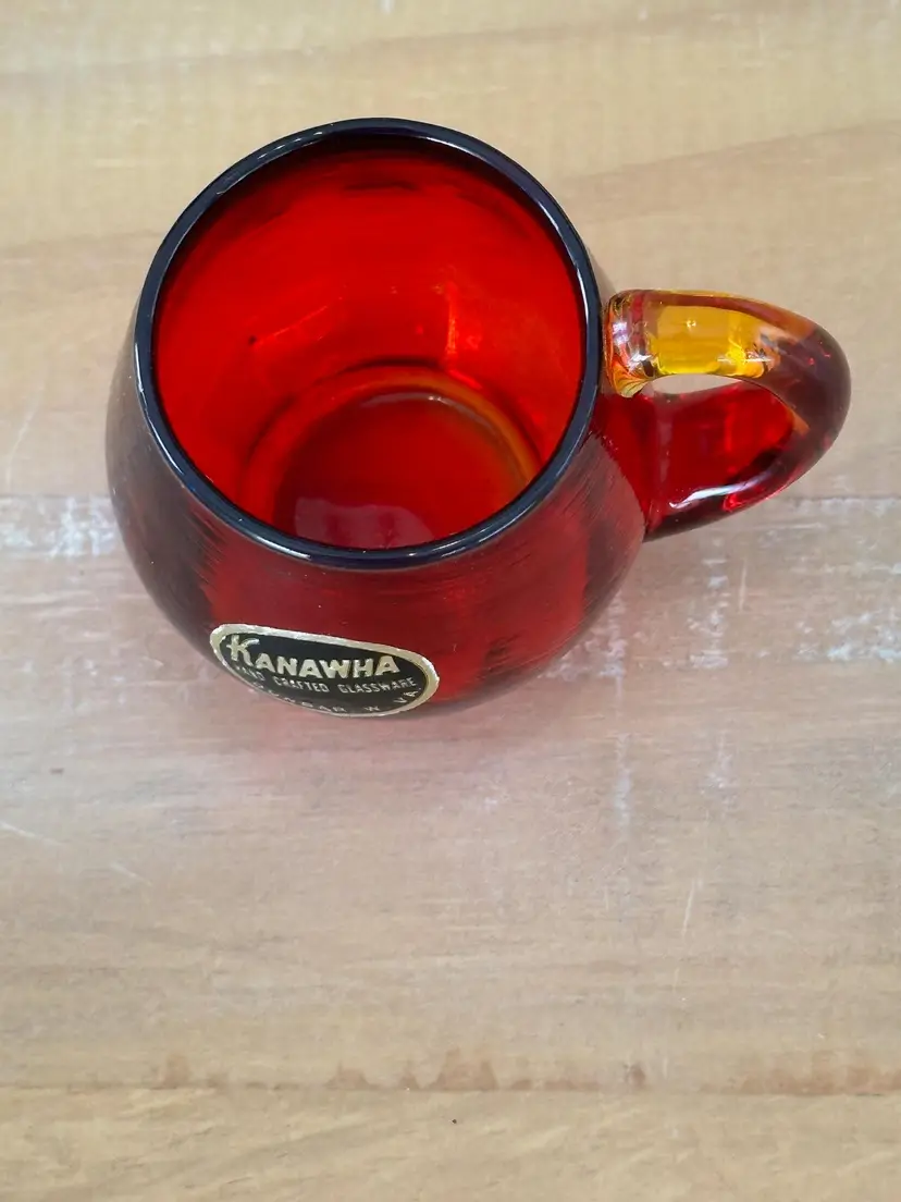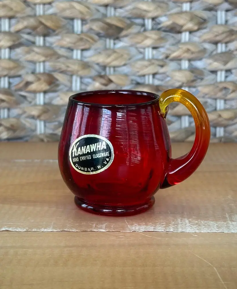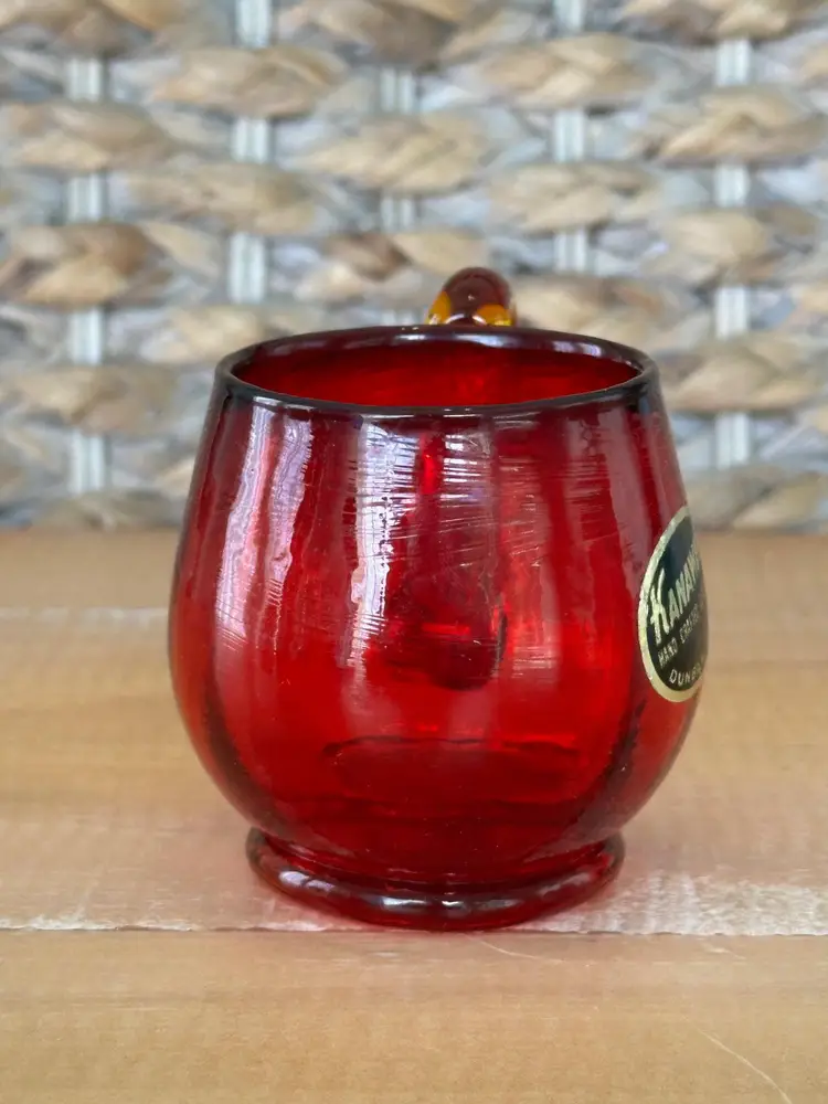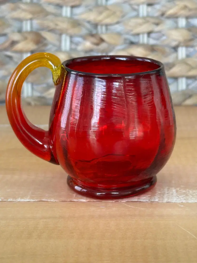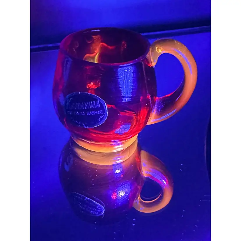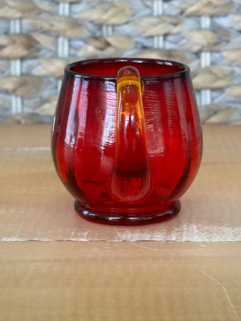 Add a pop of color to your collection with this vintage UV reactive red glass mug. Perfect for display or use, this unique piece glows beautifully under UV light. A must-have for glassware enthusiasts. W: 3" D: 2.25" H: 2.25"
