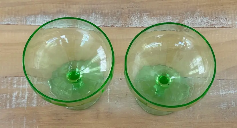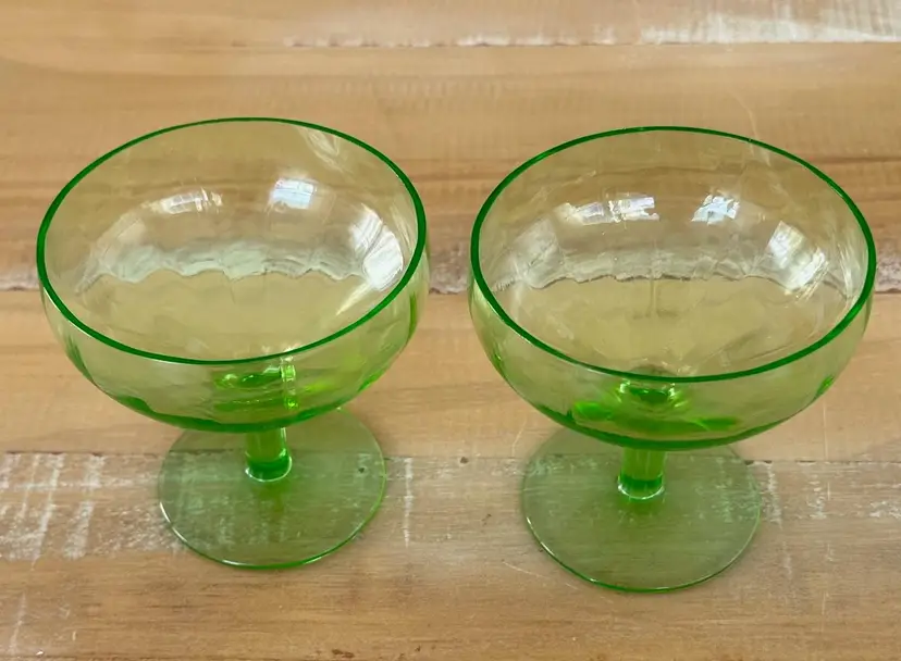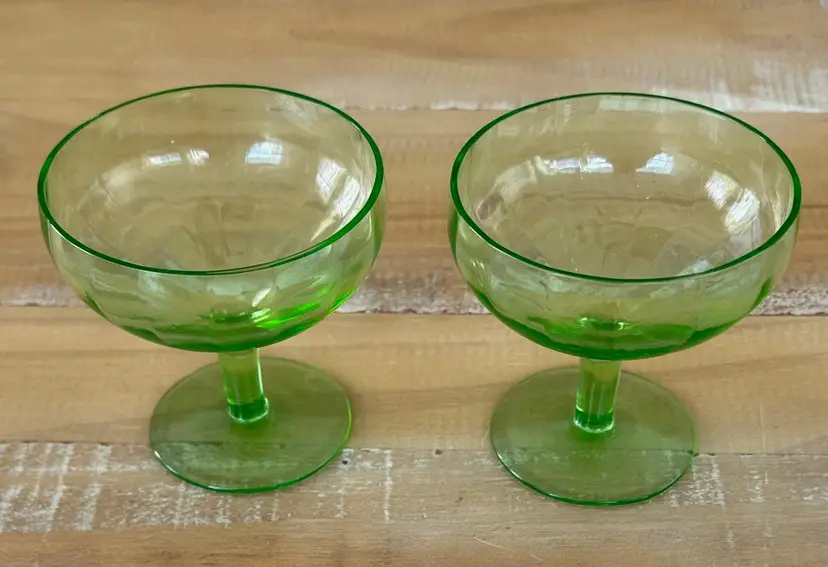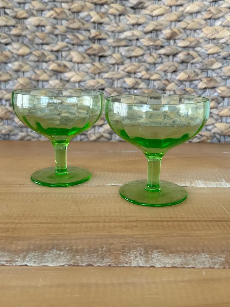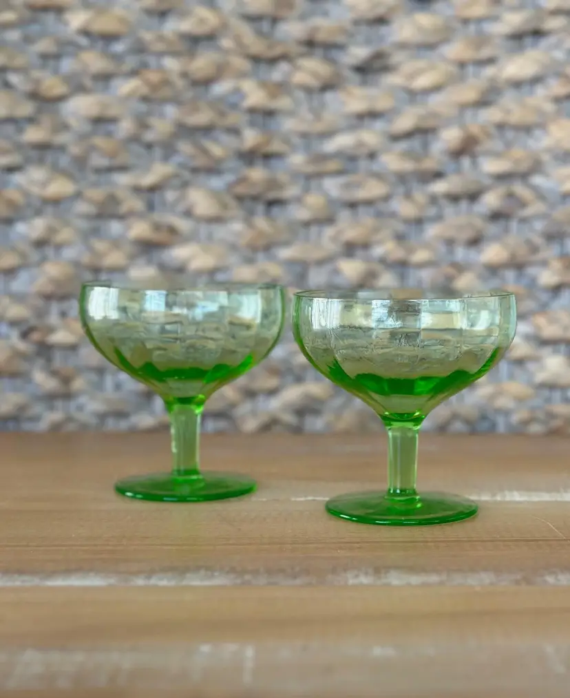 Add a unique touch to your glassware collection with this pair of vintage uranium glass champagne coupes. Perfect for a wedding, anniversary or just a fun and fancy Friday night! These stunning glasses glow a vibrant green under UV light, making them perfect for special occasions or as a standout display piece. W: 3.5" H: 3.5"