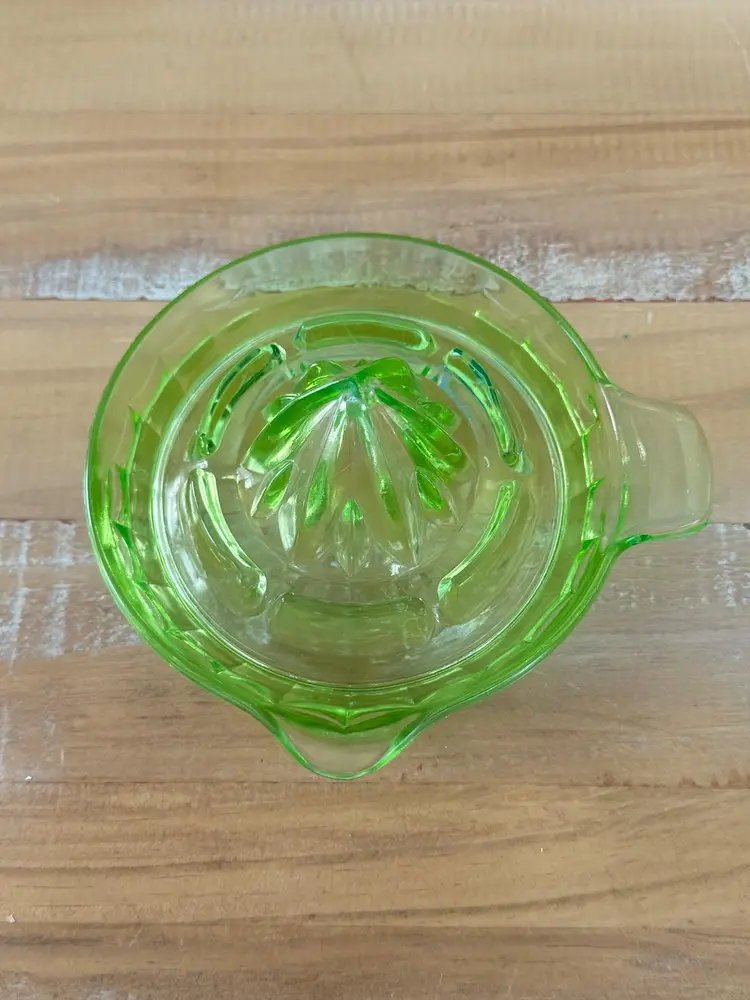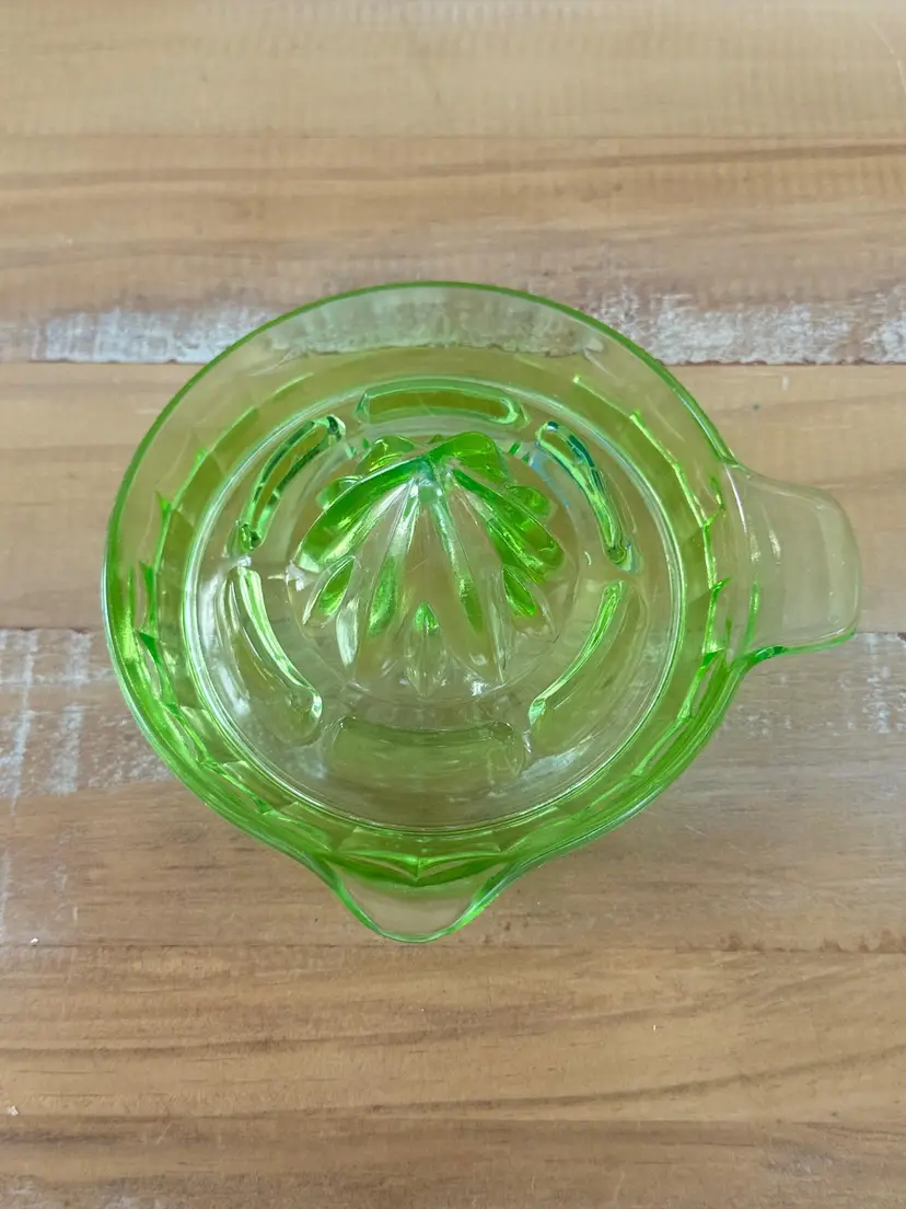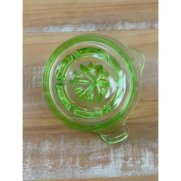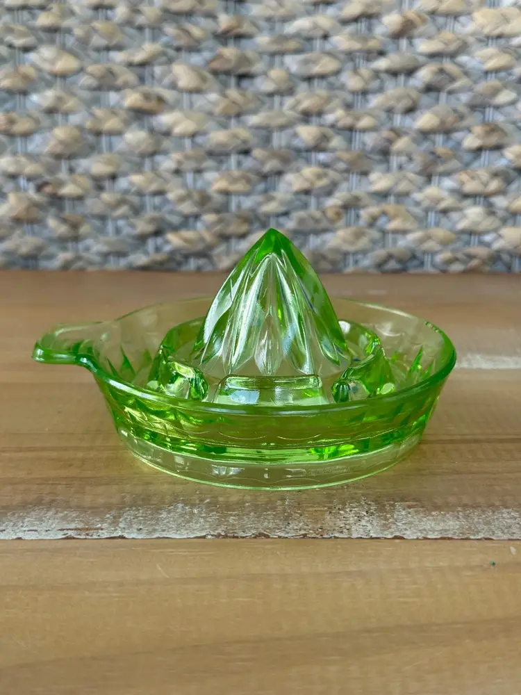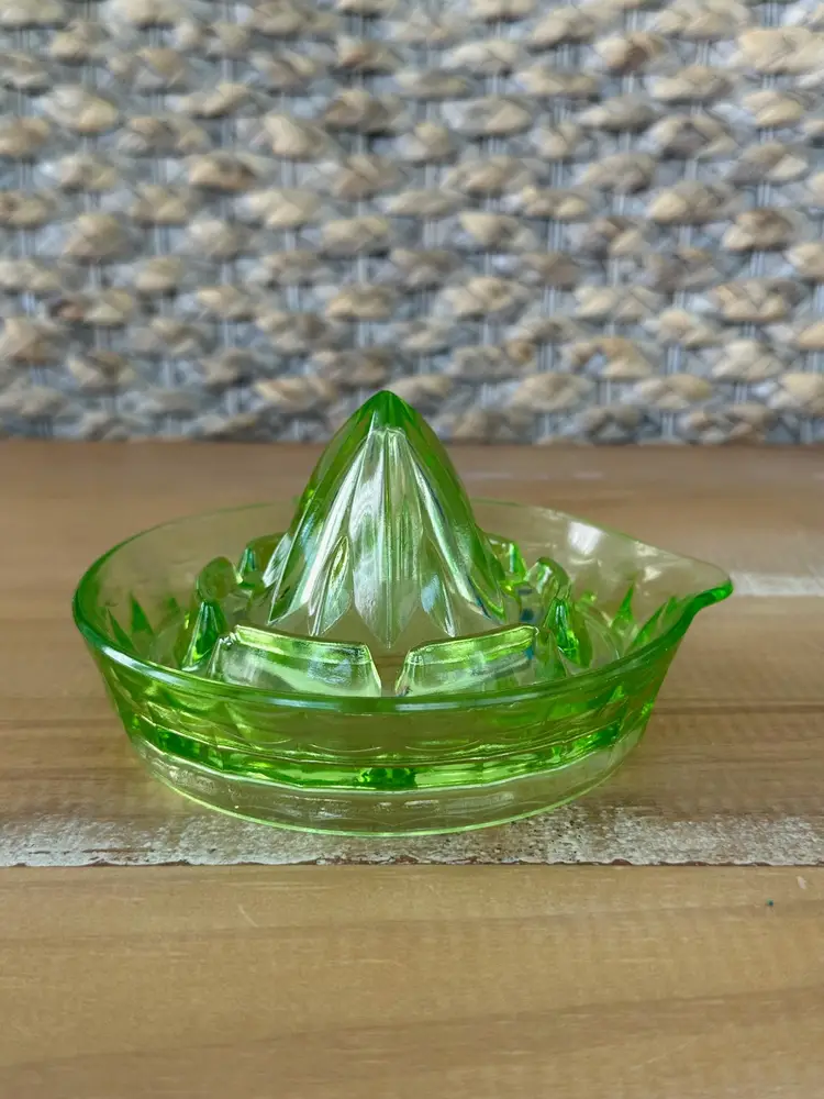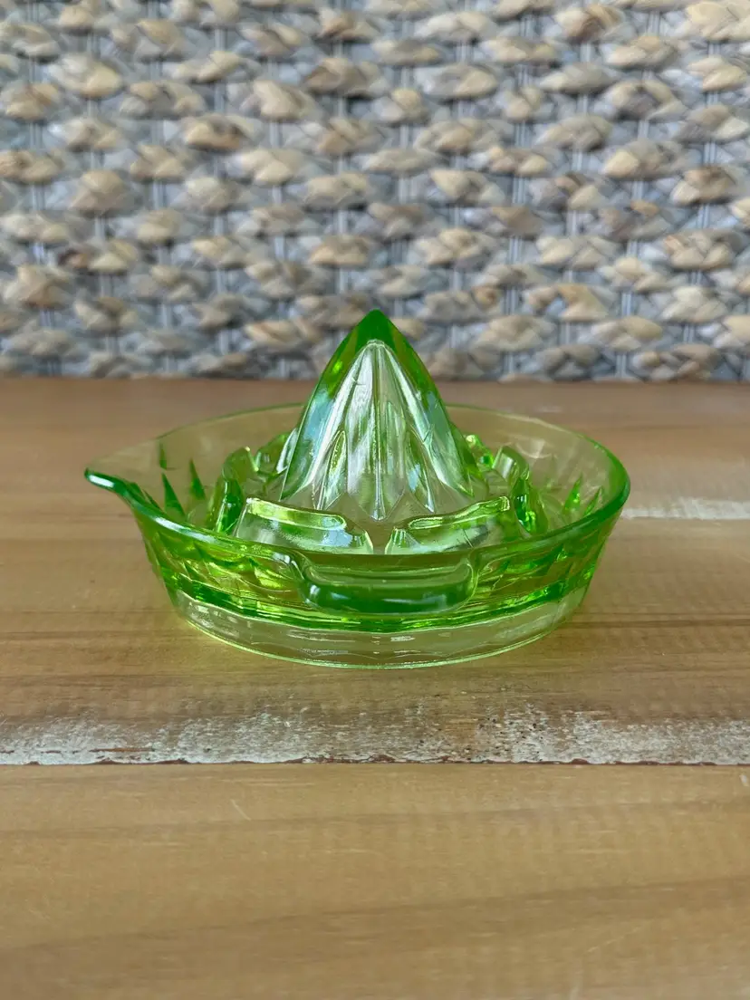 Add a unique touch to your kitchen with this vintage uranium glass citrus juicer. It glows brilliantly under UV light, making it a standout piece for both use and display. Perfect for collectors or anyone who loves a bit of retro charm. W: 6" H: 3"