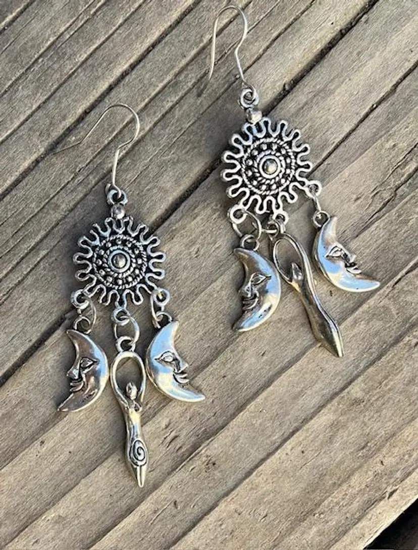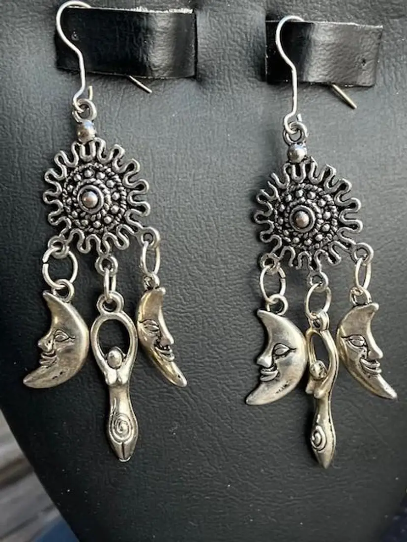 This pair of earrings features a Goddess Figure and Moon Face. Ear wires are sterling silver. Approximately 3 inches long and 3 1/8 inches wide.