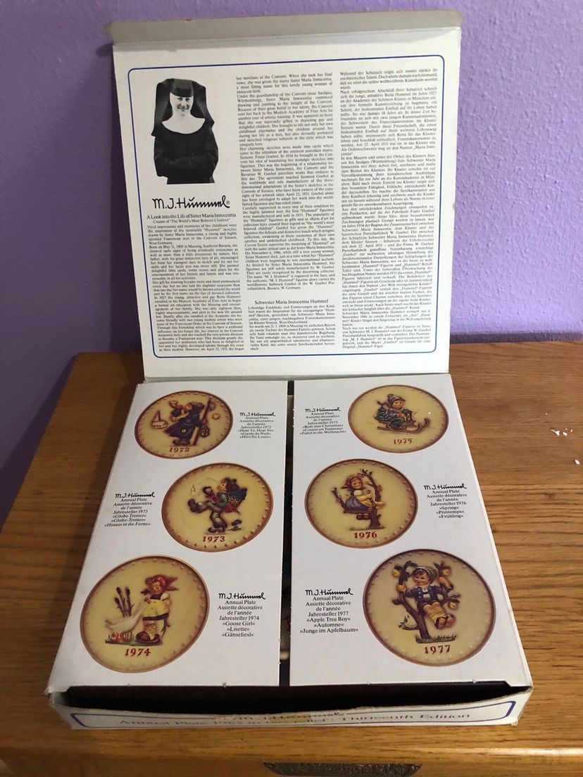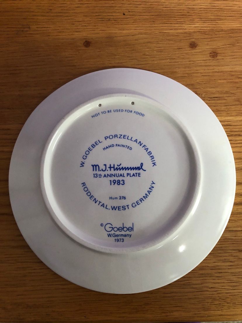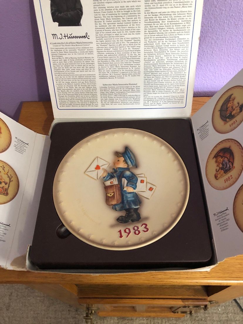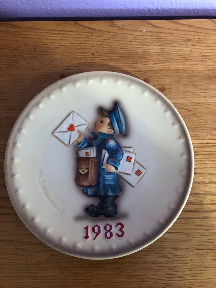 Hummel annual collectors plate from 1983. Features little mailman in bas relief. Bright colors with no chips or cracks! Comes with original box with some age/wear. Plate is 7 1/2 inches in diameter. Box is 9 inches.