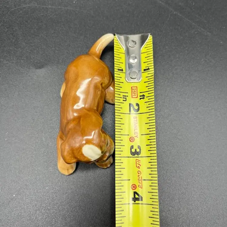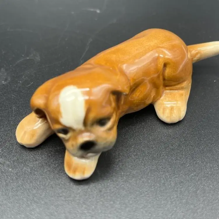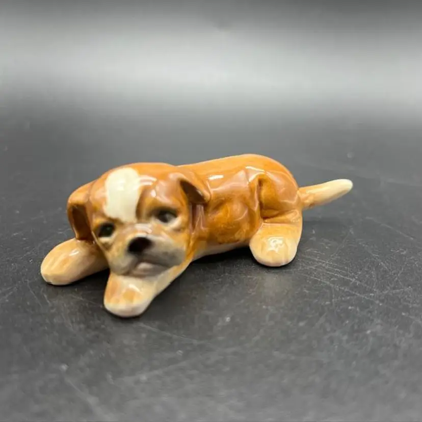 Charming puppy figurine with a glossy finish. Perfect for collectors or as a cute addition to your home decor. Measures approximately 3 inches long.