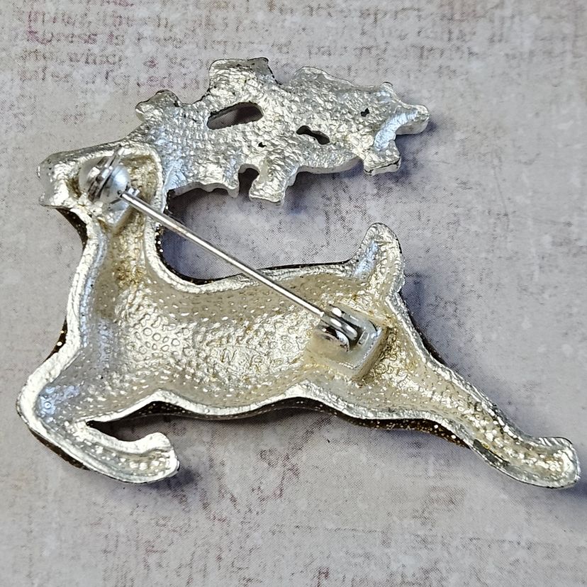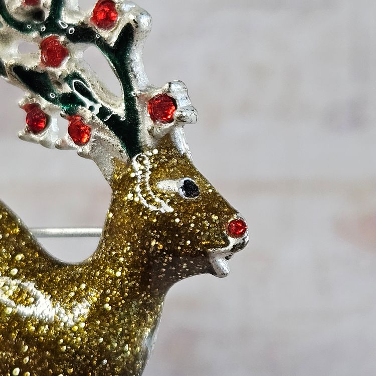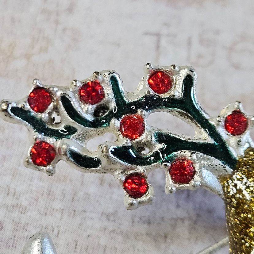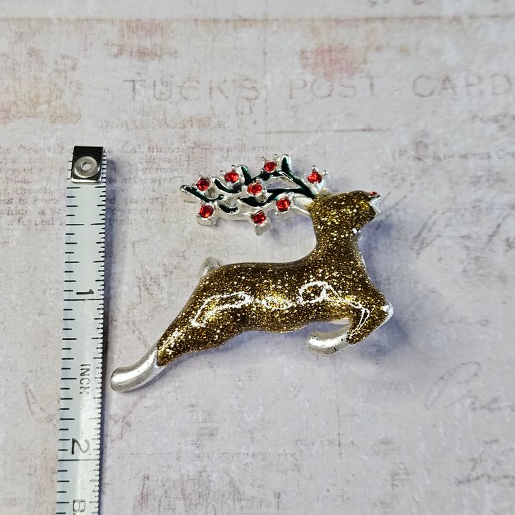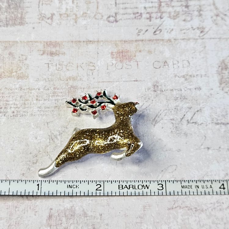 Sparkly deer pin measures approx 1.75". Marked N R, which is Nina Ricci. Rhinestones are vibrant red. Looks great.