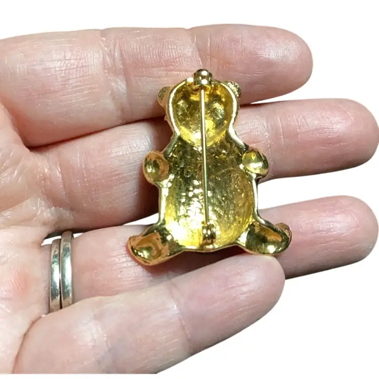 Gold Tone Bear Brooch With Clear Rhinestones And Blue Belly 1.25” T X1” W
