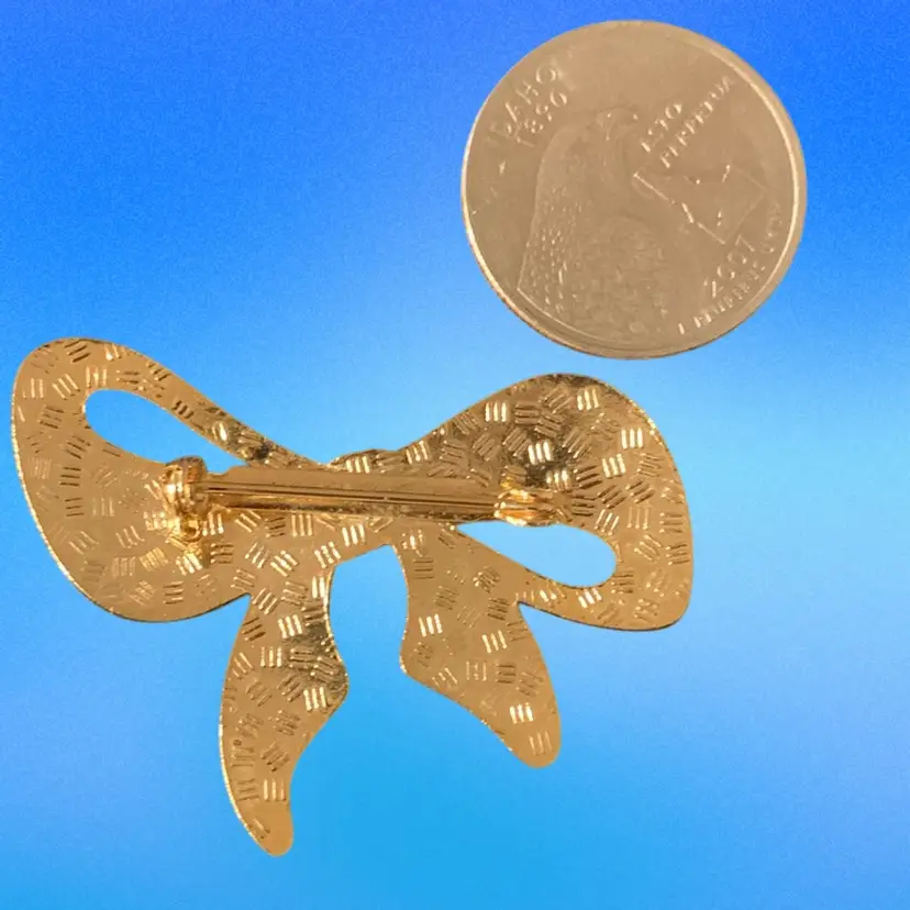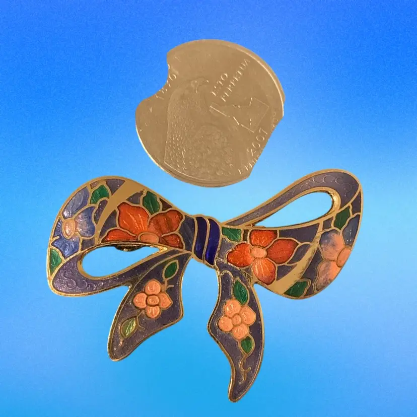 Gold Tone Enamel Bow Brooch Red And Pink Flowers On Blue Background