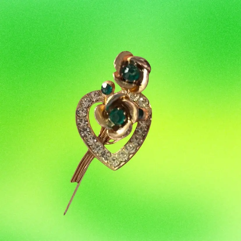 Gold Tone Heart Shape Covered With Clear Rhinestones With Green Rhinestone Flowers.