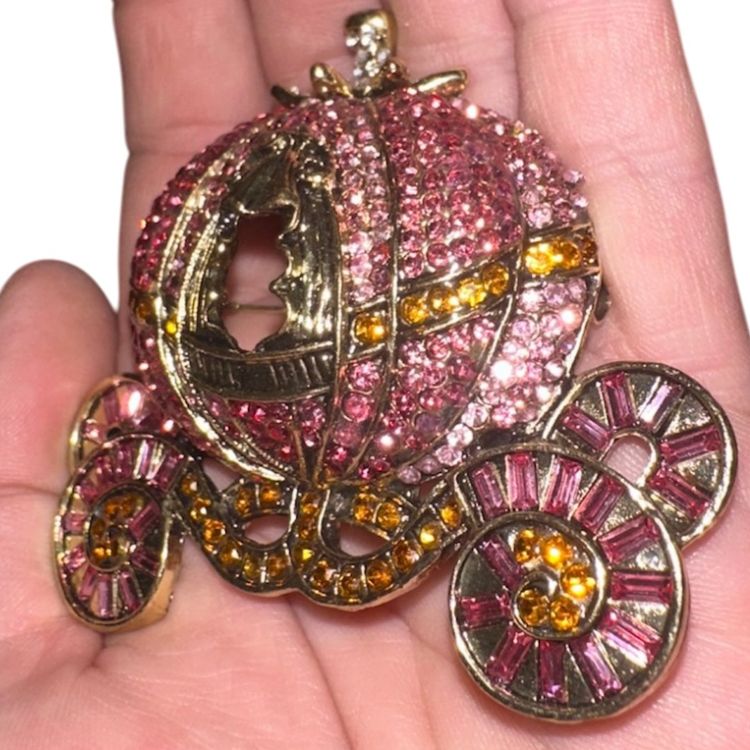 Gold Tone Pink & Orange Pumpkin Cinderella Coach Pin Rhinestone Brooch 2.5” tall x just over 2.5” wide