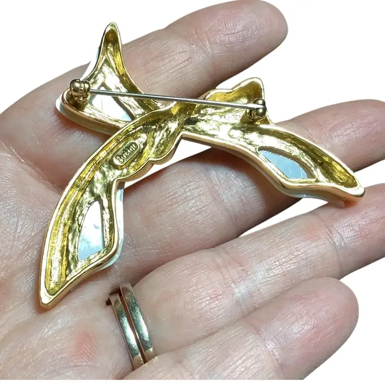 Gold Tone Yellow Shell Now With Clear Rhinestones Brooch “ Butler”2.5”LX 2”W