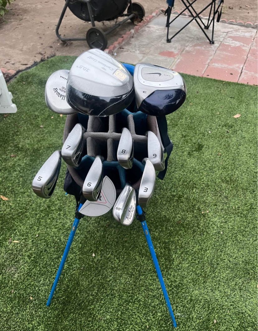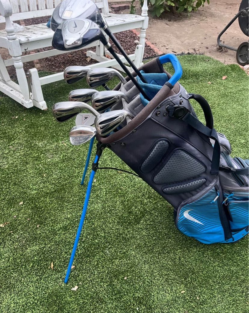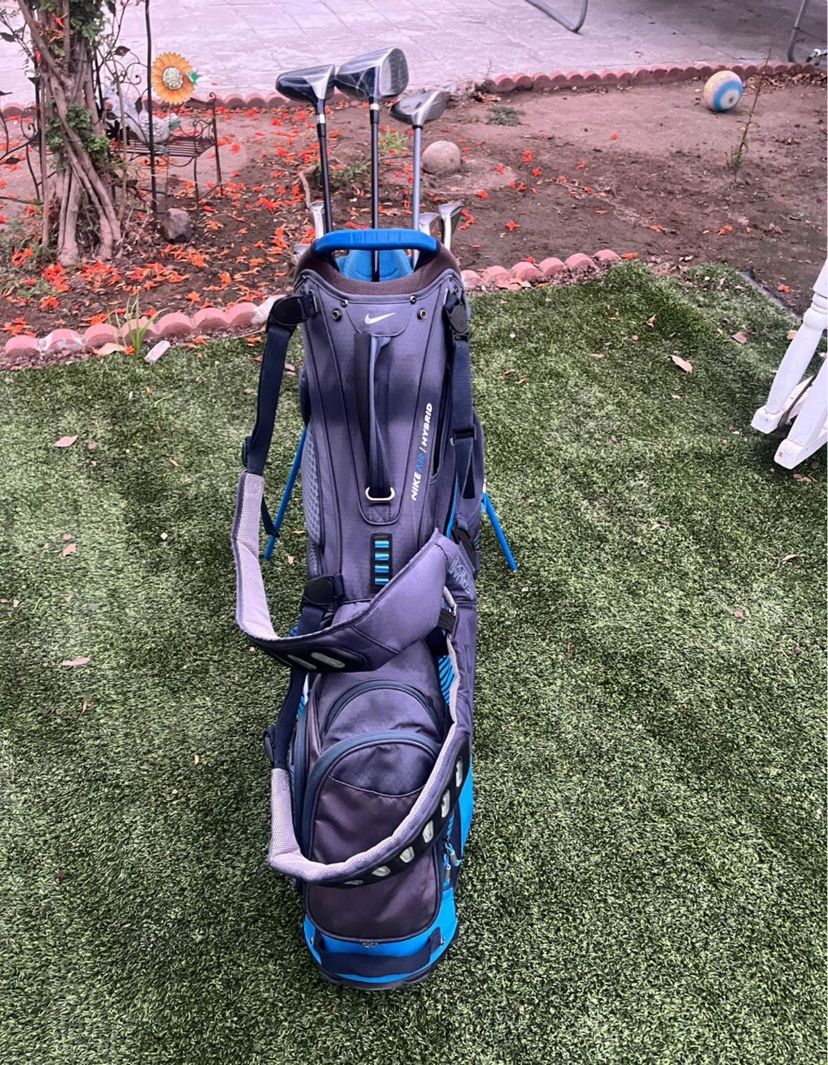 3-5-6-7-8-9- Nike set Top flight putter new Wedge tour edge 1-callaway 4 wood 1-Nike hybrid 1- Carlton driver new Graphic RM flex on bike set All grips in good condition Stand up Golf bag Nike