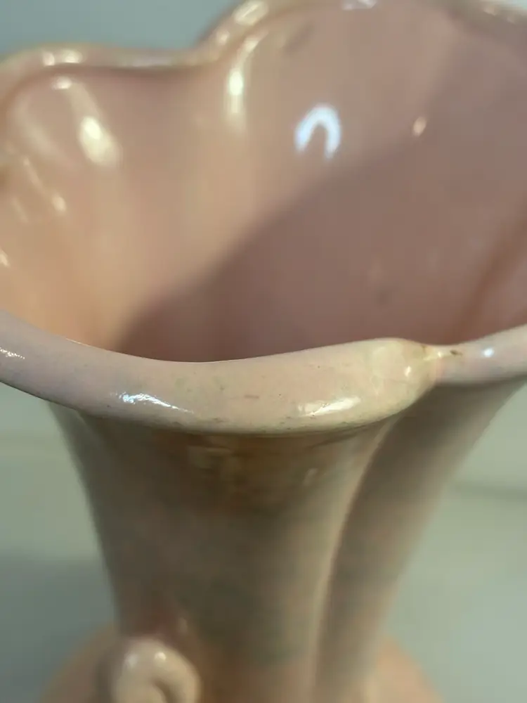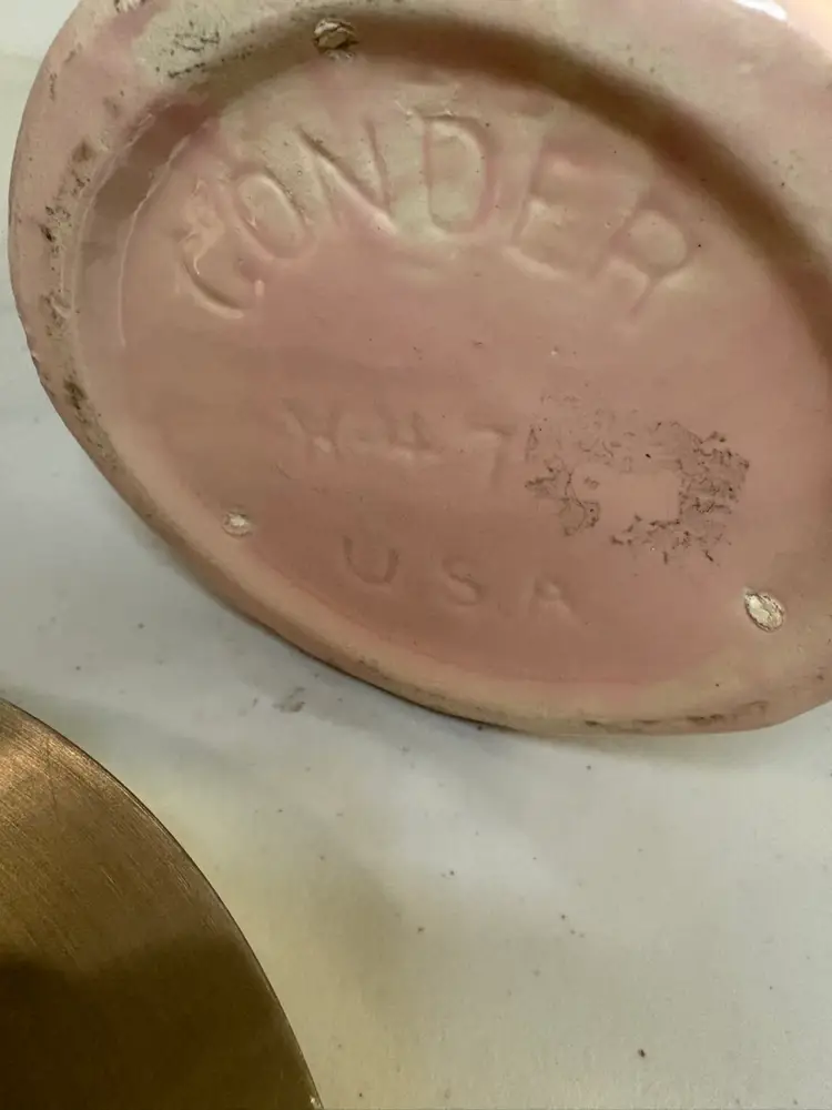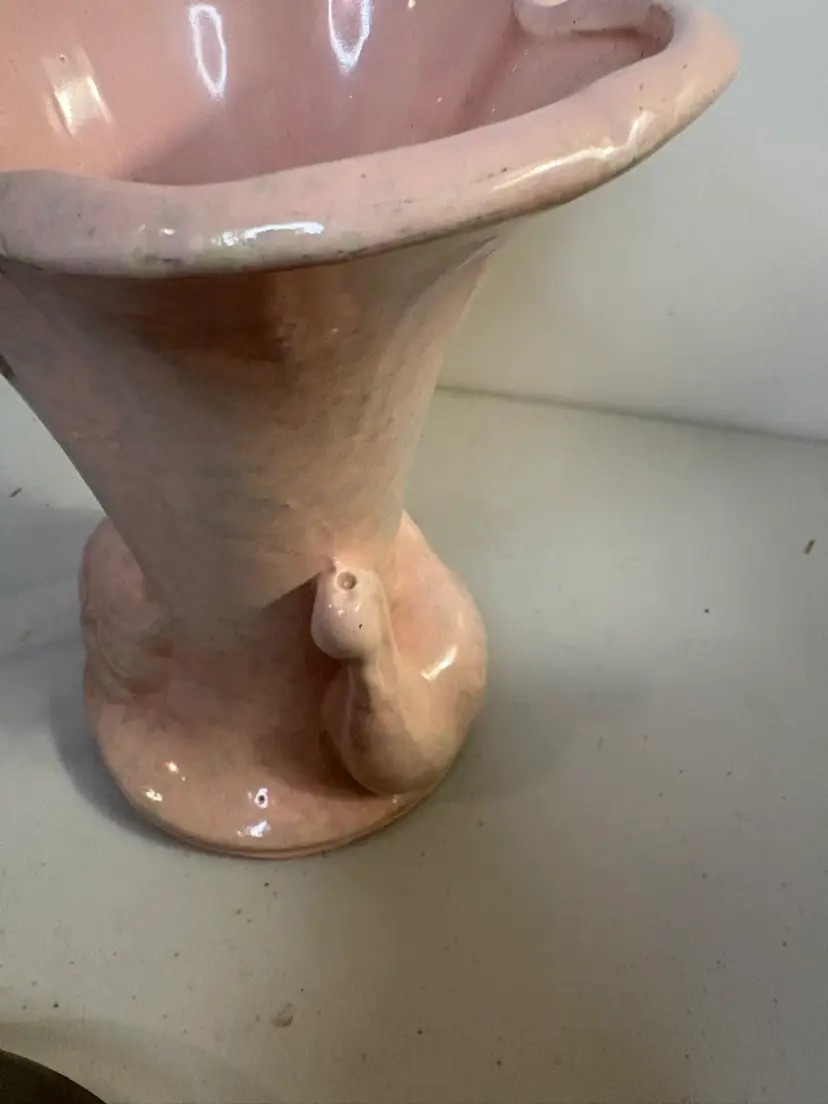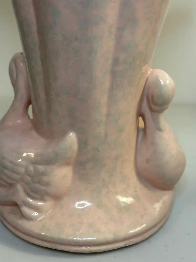 The Gonder Double Swan Pottery Vase is a stunning piece of mid-century modern art pottery originating from California in 1949. Handmade with a glossy finish, this original double swan vase features a beautiful pink color and bird-themed design. Measuring 8 inches in height and 5 inches at the base opening, this vintage piece is crafted with a ceramic material and bears the Gonder brand. A solid pattern and impressed backstamp add to the charm of this unique decorative vase, perfect for any bird-themed or mid-century modern decor.