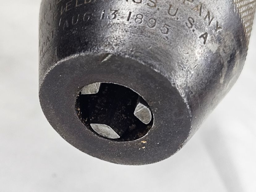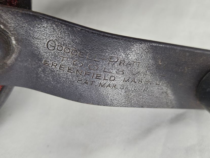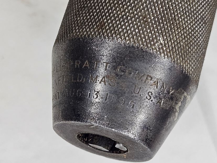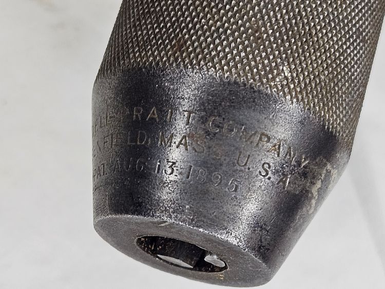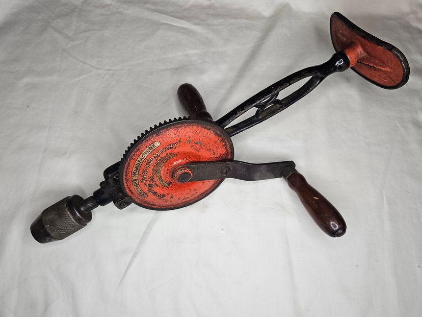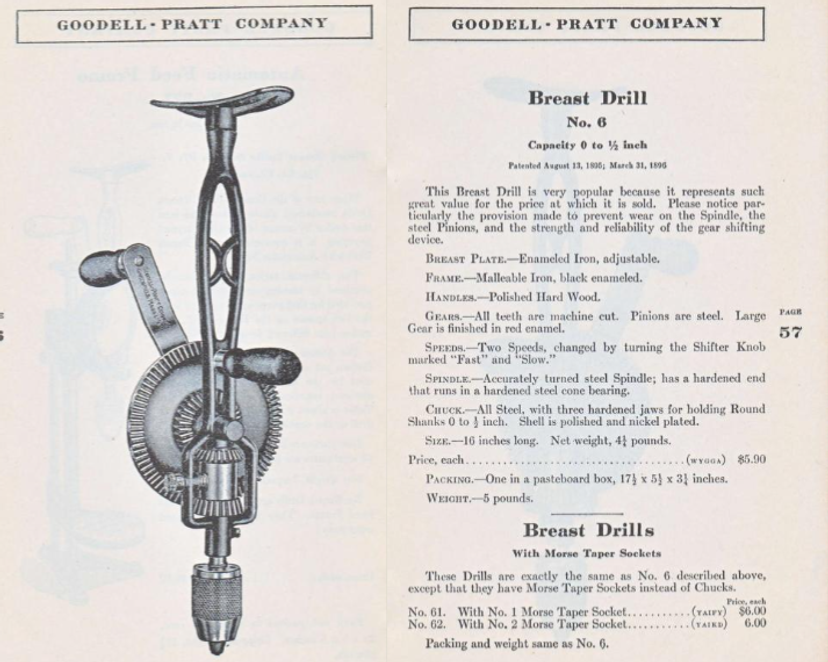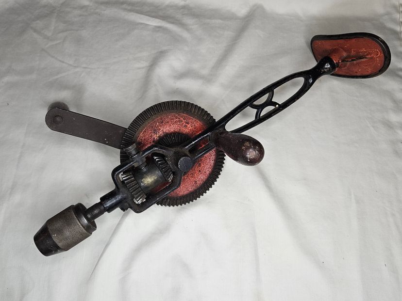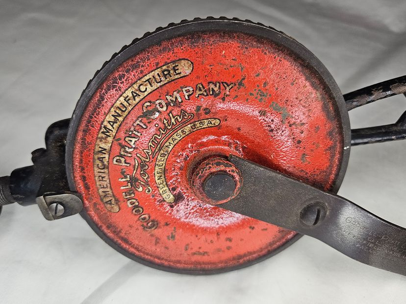 I believe this is a No. 6 or No. 245 based on the G-P catalogs. One model had nickel plating, the other didn't. This drill has two speeds that can be changed by adjusting the shifter knob to switch between "fast" and "slow" for drilling in different materials. 3-jaw chuck takes round shank bits 0-1/2".