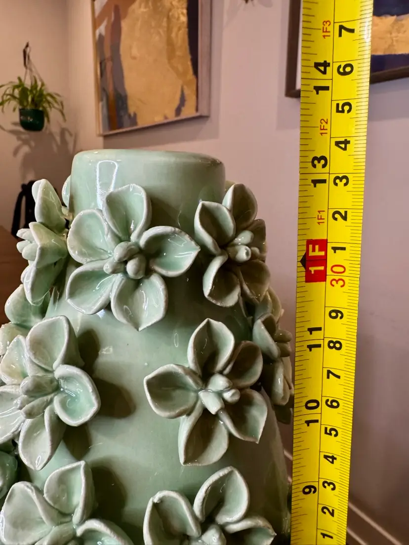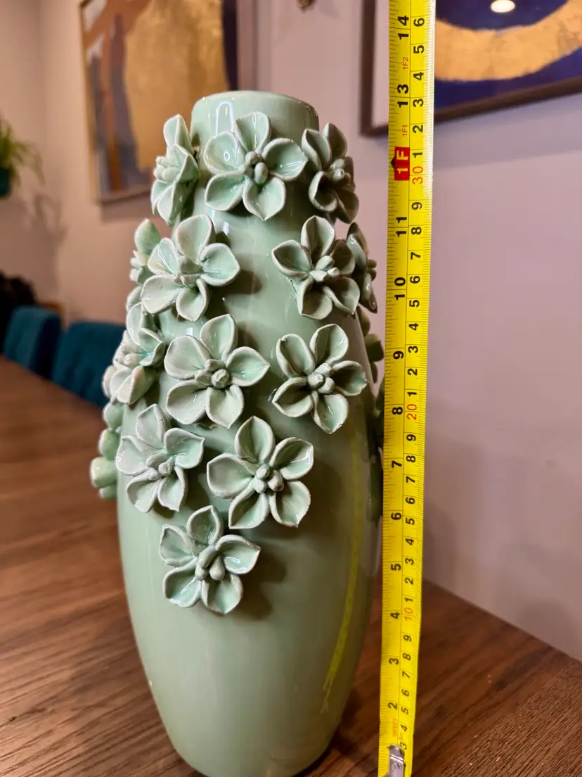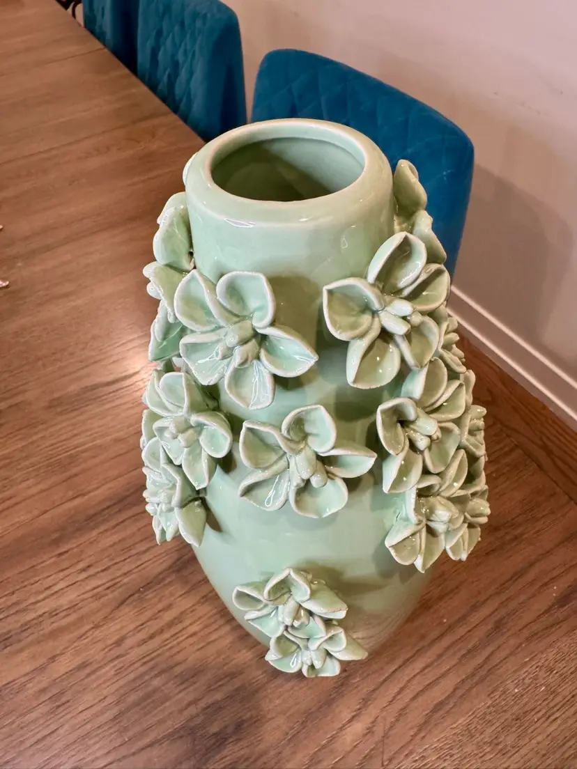 light green ceramic vase decorated with hand-applied, sculpted flowers. The vase is described as a Sylas Petite Fleur Vase. The vase has a multi-floral design with sculpted buds. It is a ceramic pottery vase. 3-D floral design. The hand-applied nature of the flowers means each piece is unique