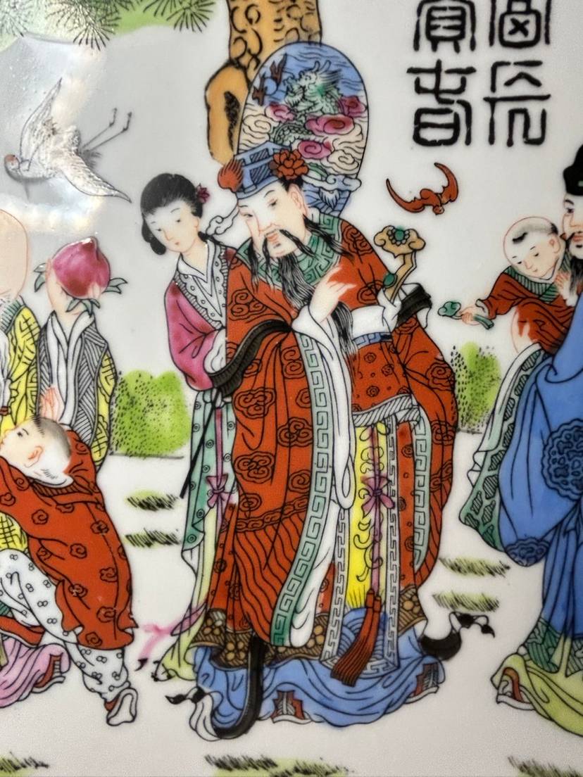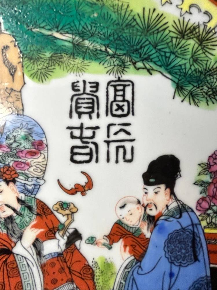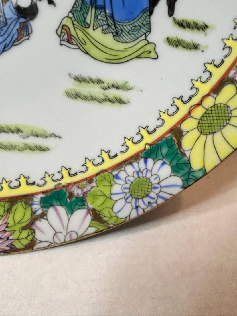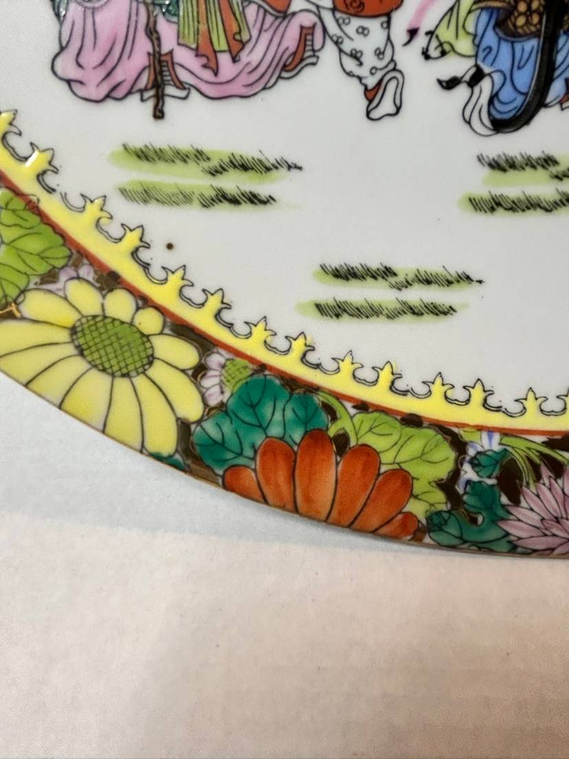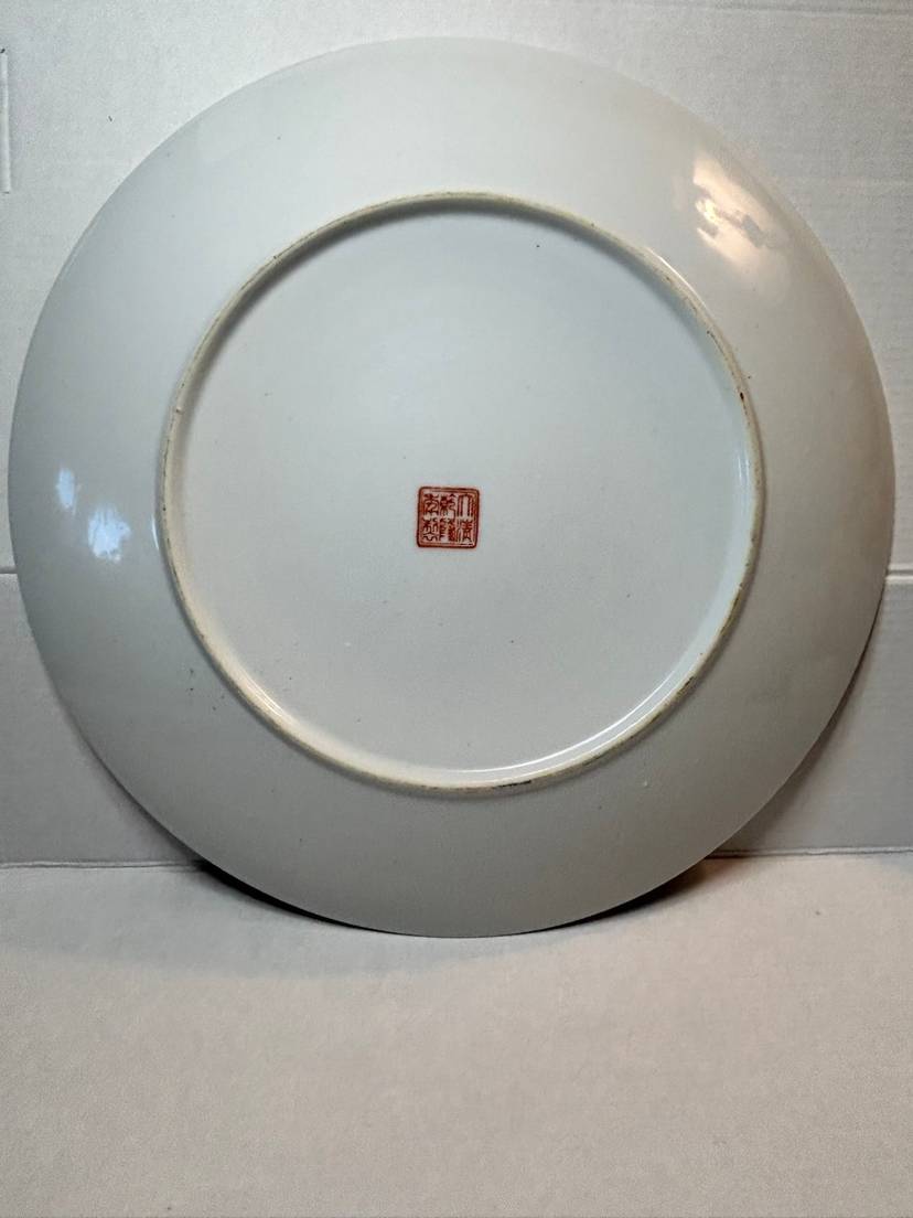 This is a vintage Chinese Famille Rose porcelain plate. The term "Famille Rose" refers to a type of Chinese porcelain that originated in the 17th century and is decorated with hand-painted enamels, predominantly in pink, white, yellow, and green. The style was produced until the early 1900s, with a revival in the 1960s.