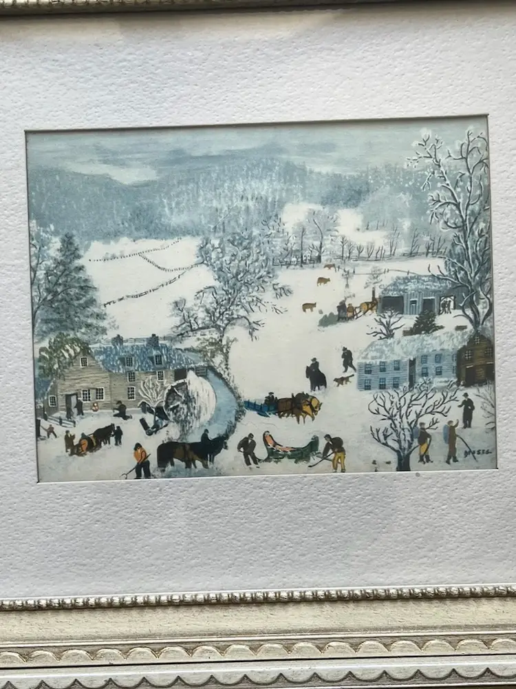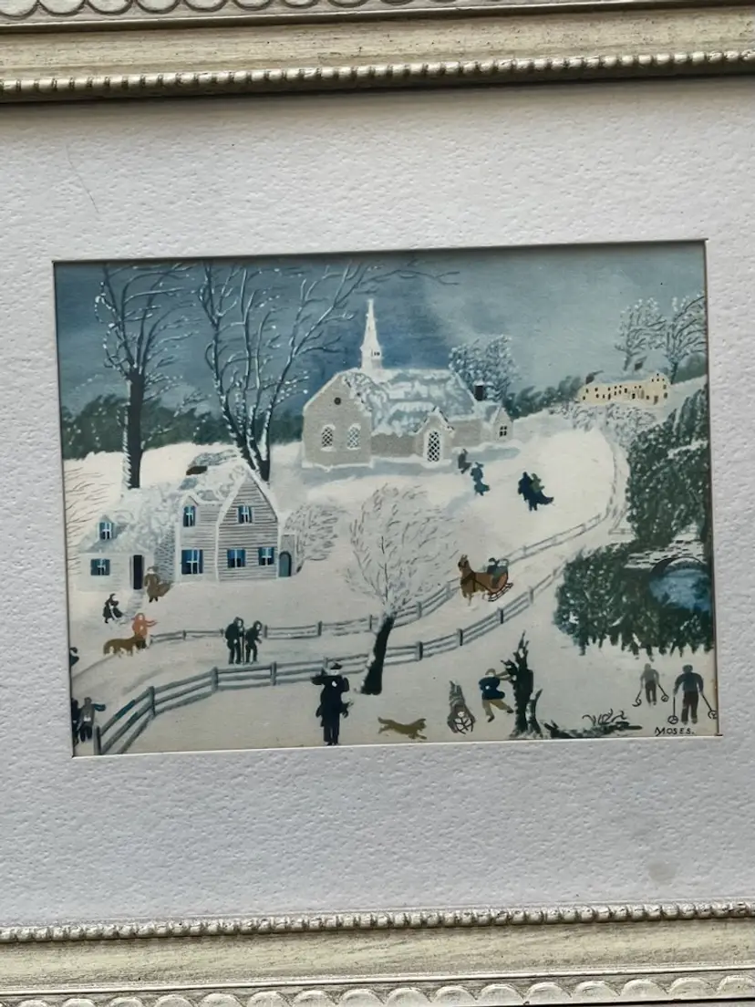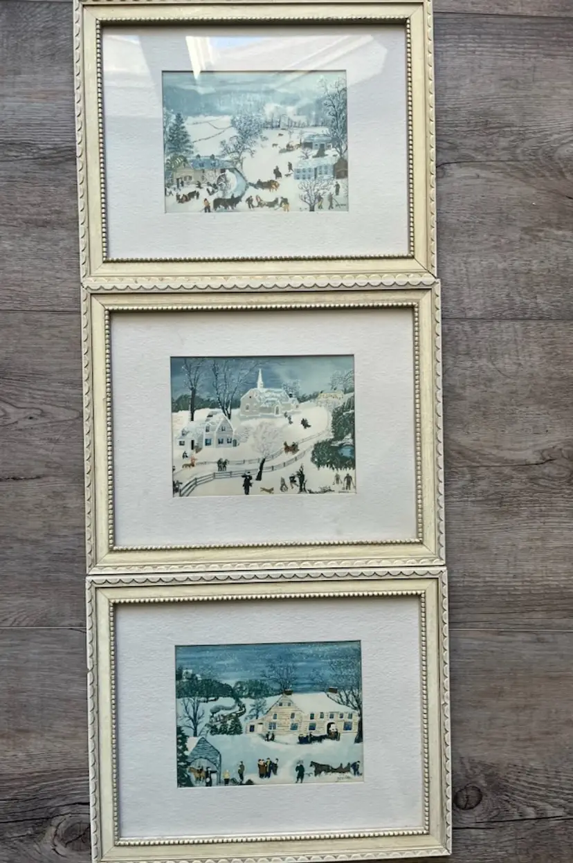 A set of three Grama Moses Pictures. Framed 8x10. They have Moses for the signature. Painted wood frames with glass. Pre-owned. All glass is good. Frame is good. Two of the matting have small spots. Please see photos. I believe they are painted because of the depth. I am not an authority on pictures. If you have any questions, please feel free to ask.