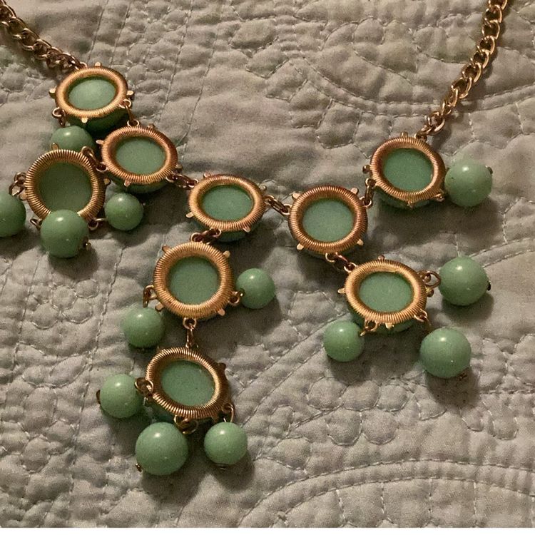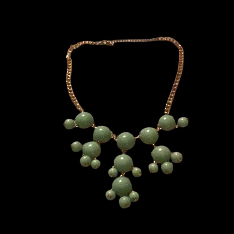 Green bib style gold toned necklace lobster claw clasp . I think these might be plastic.
