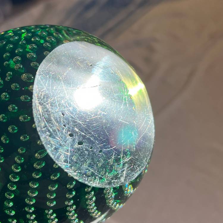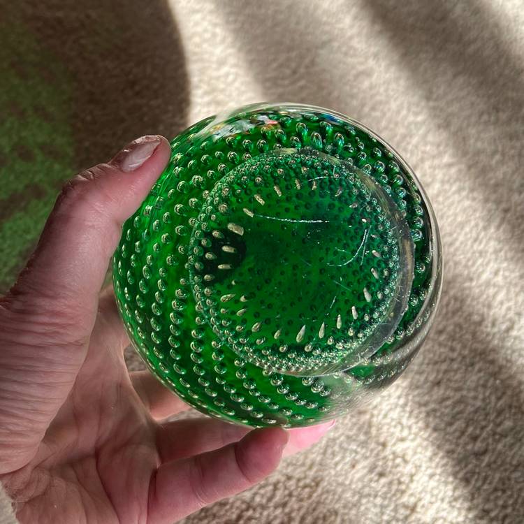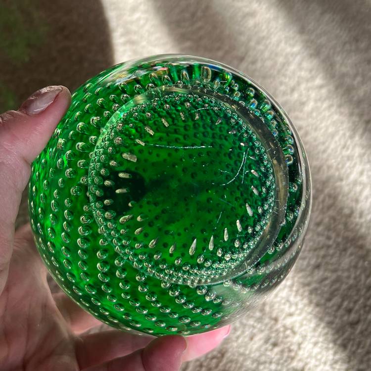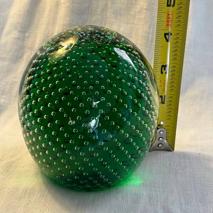 Gorgeous egg shaped paperweight, green in color, is a stunning example of Bullicante - controlled bubble mastery. Measurement in photos. Heavy, weighs 3 lbs 13 oz unpacked.