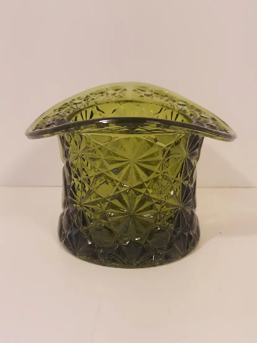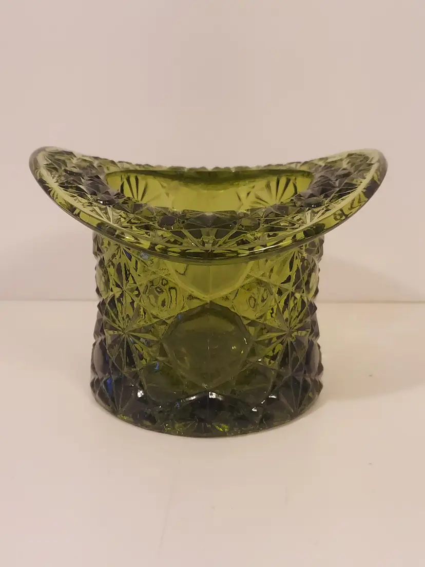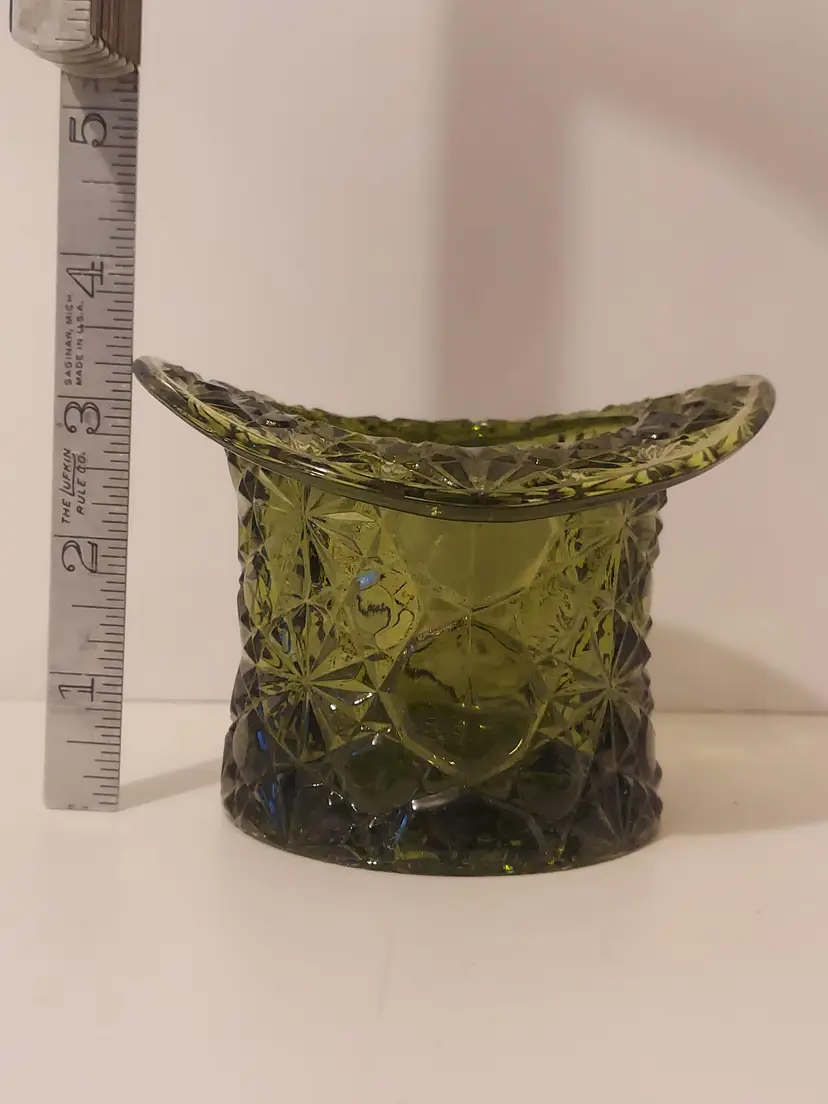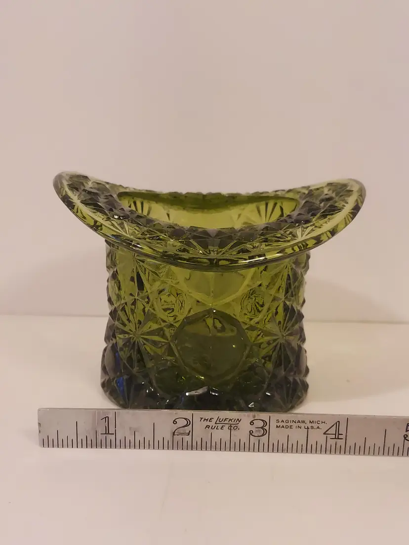 This vintage green glass top hat measures approximately 4.5×3.25 inches. There is a manufacturer's defect on the edge of the brim that looks like a chip. There is also a rough spot on the inside edge where the hat meets the brim, please see photos.