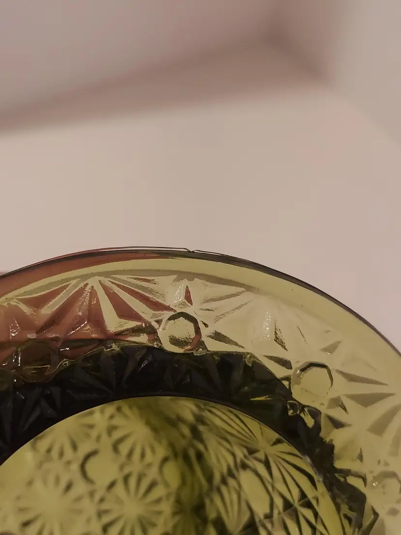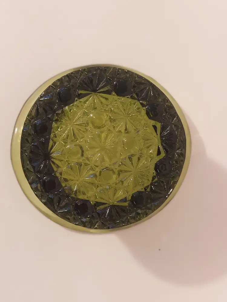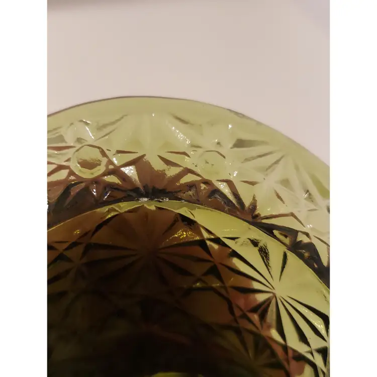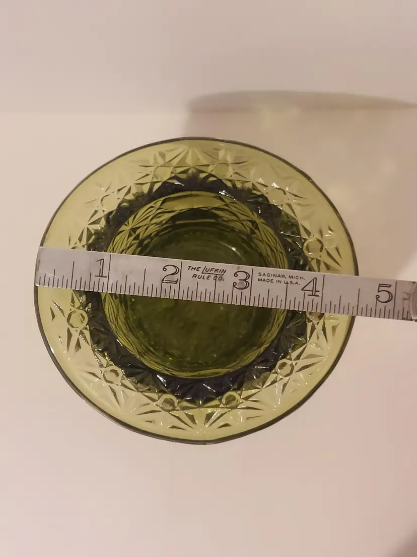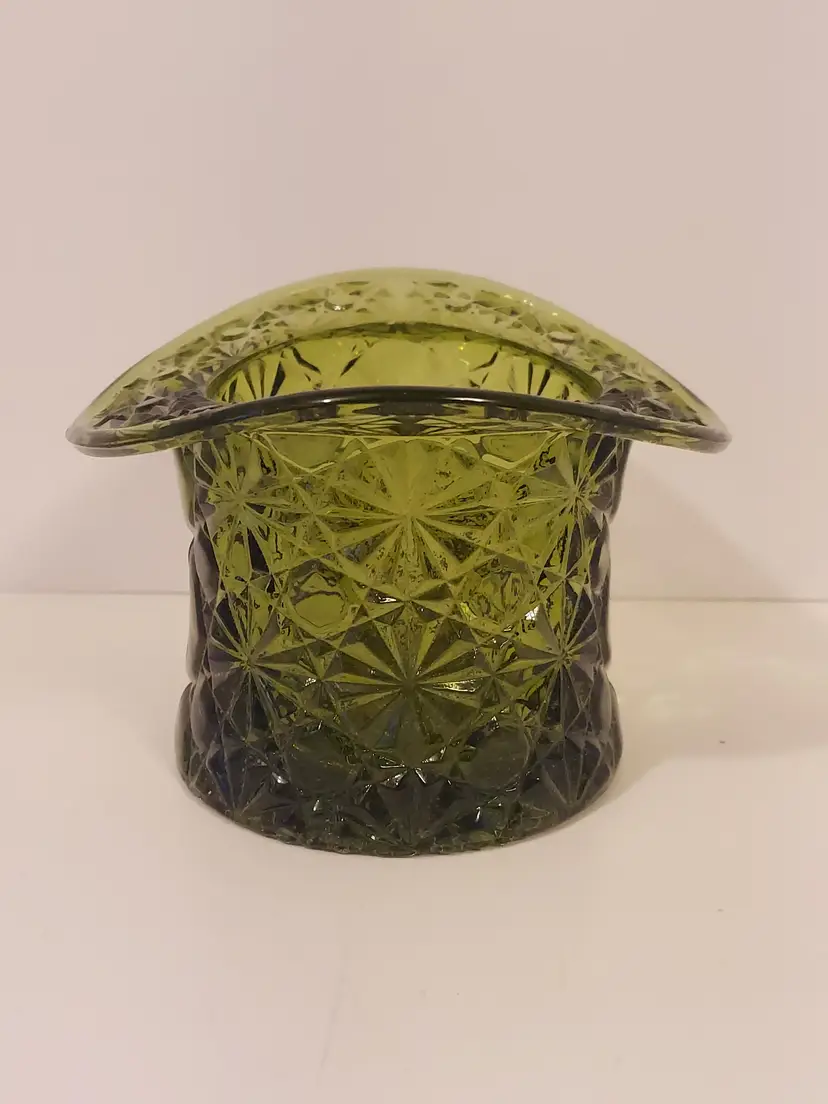 This vintage green glass top hat measures approximately 4.5×3.25 inches. There is a manufacturer's defect on the edge of the brim that looks like a chip. There is also a rough spot on the inside edge where the hat meets the brim, please see photos.