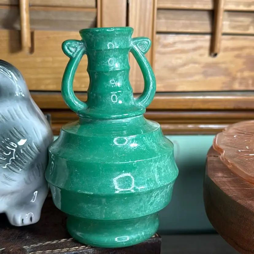 7” green vase I believe is akro agate. ?