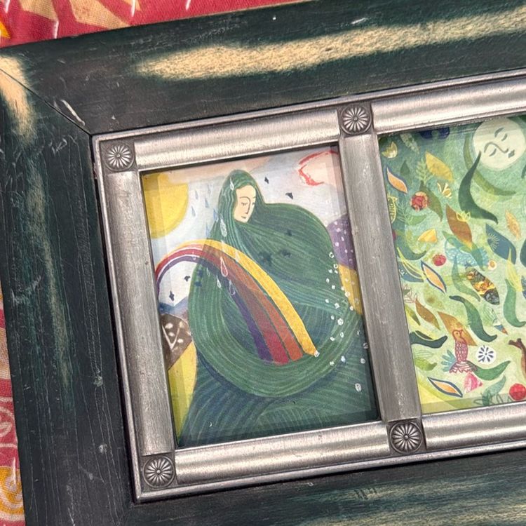 Green wood box with picture frame top. 10” wide, 5.5” deep, 2.5” tall. Natural wear on green paint. Top is a frame so you can easily change out the pictures.