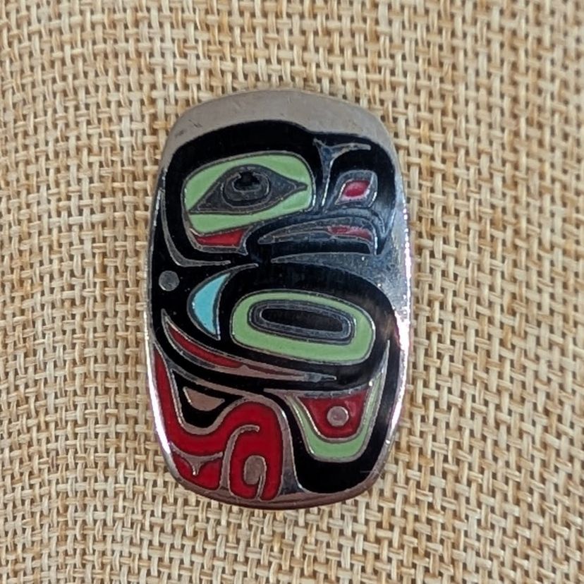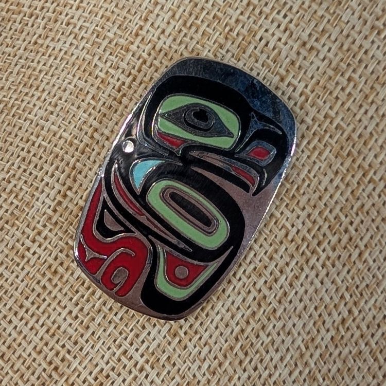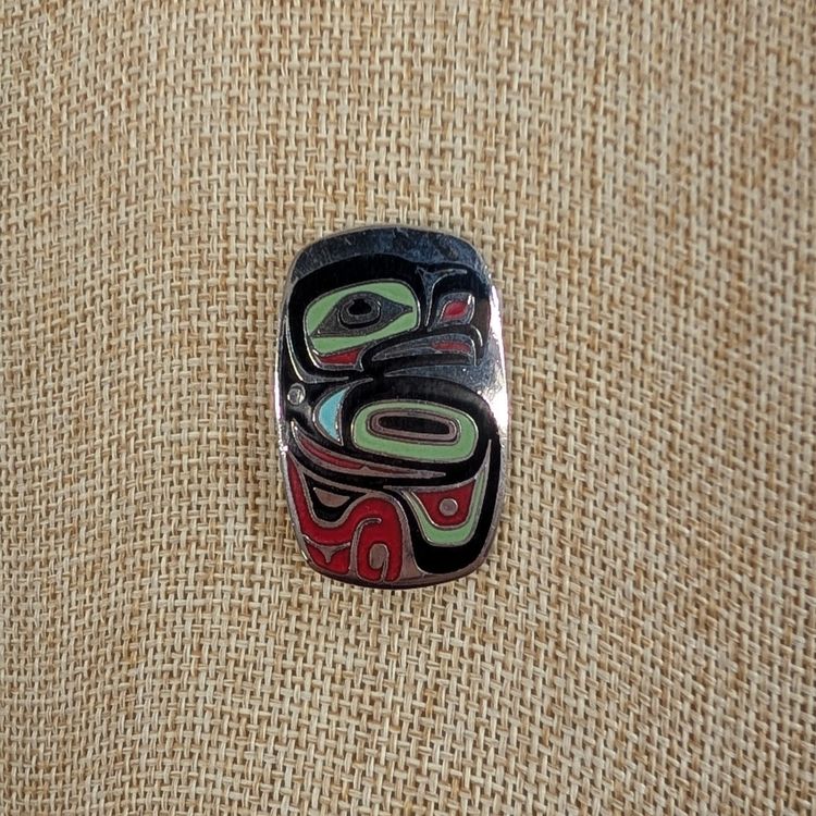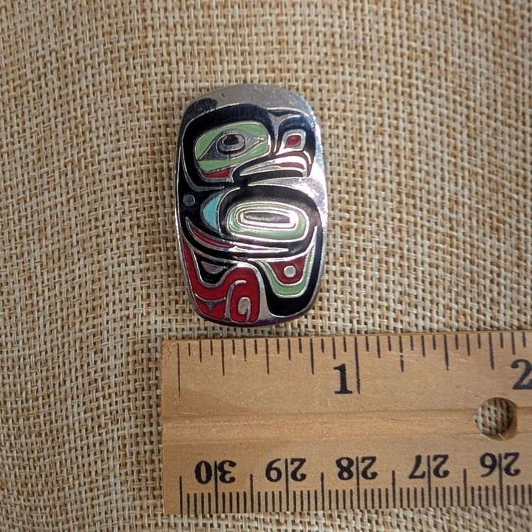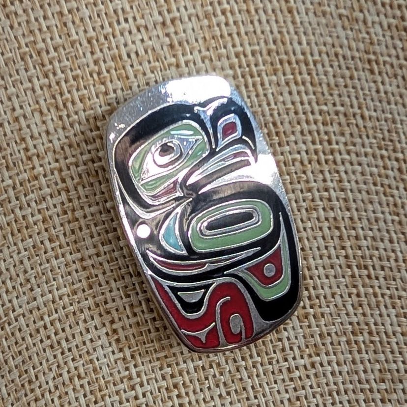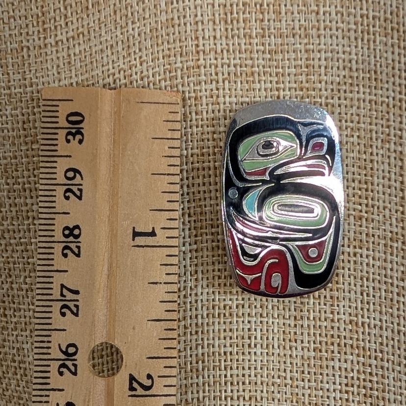 Beautiful brooch from Greg Horner with Pacific Northwest art of an eagle. In nice, used condition. Measurements ~ 7/8 x 1-5/16"