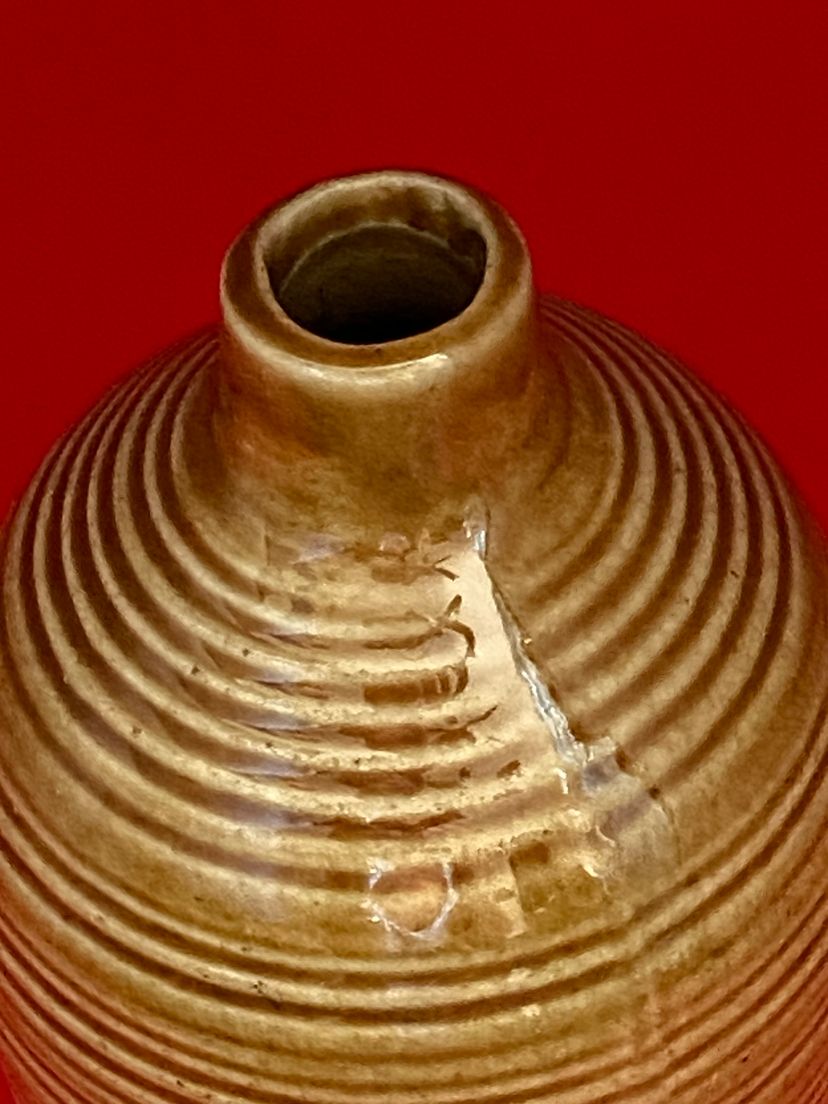 Grenade Shaped Art Pottery Vase w Horizontal Striations, 4.5" Tall