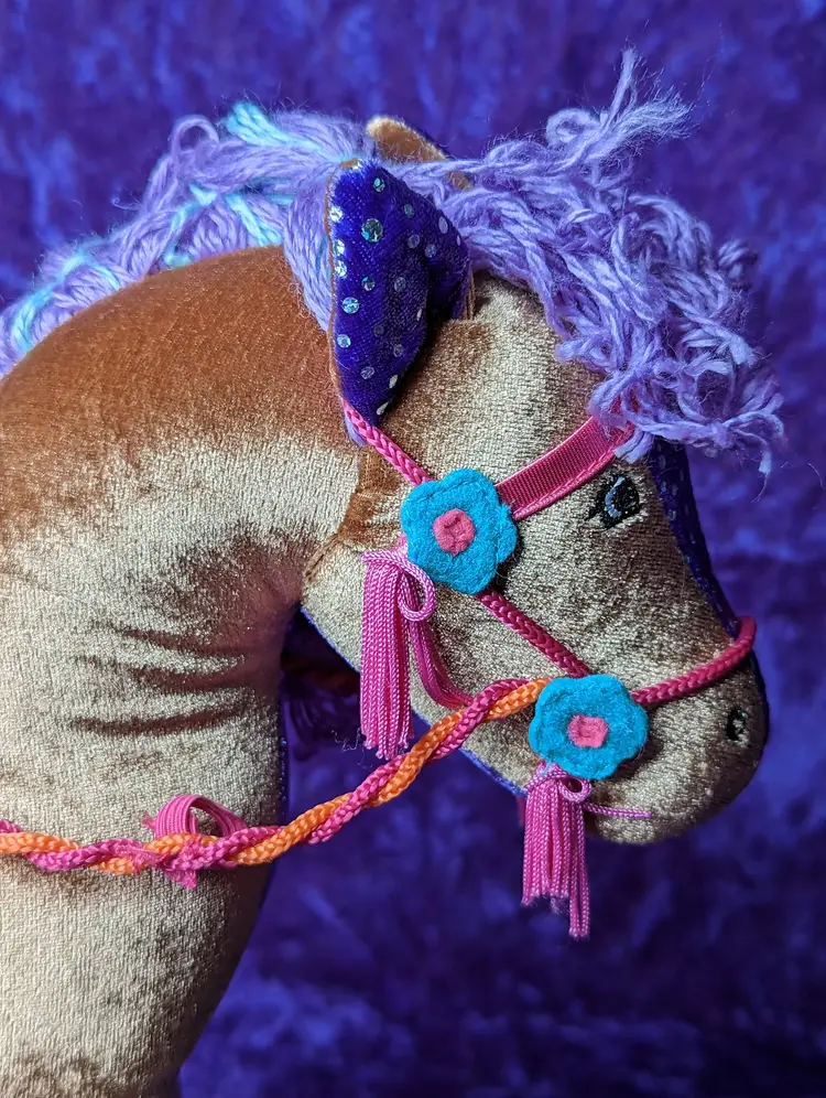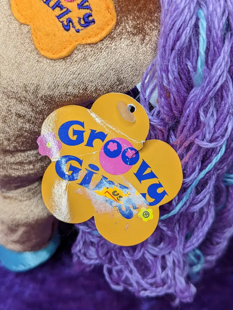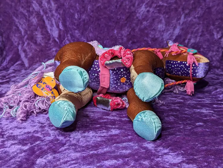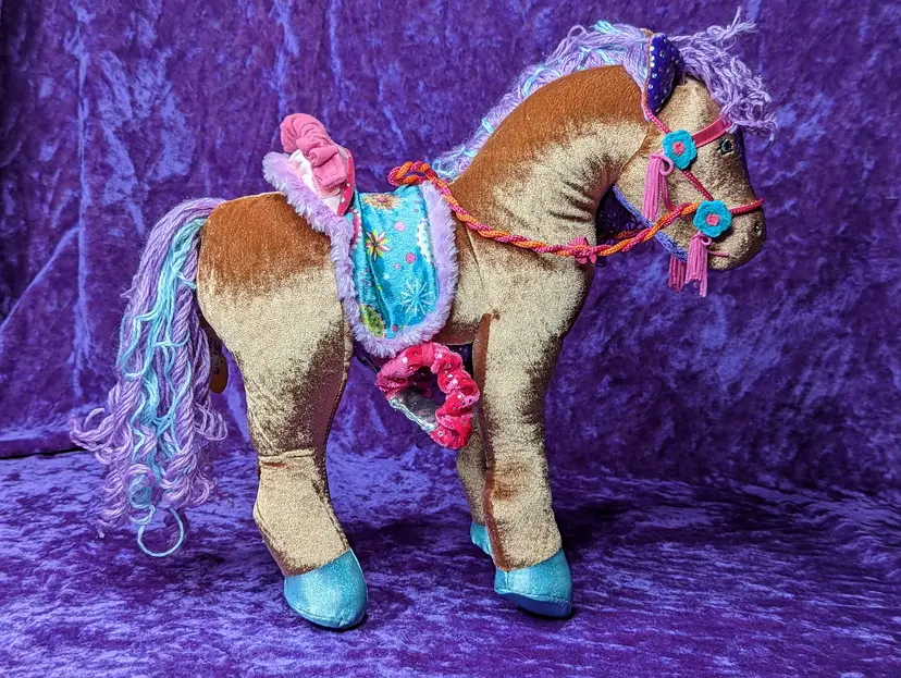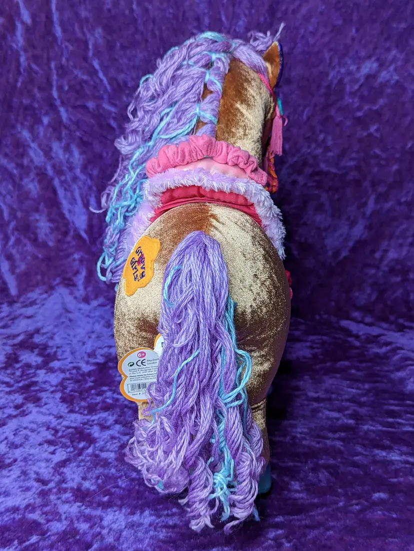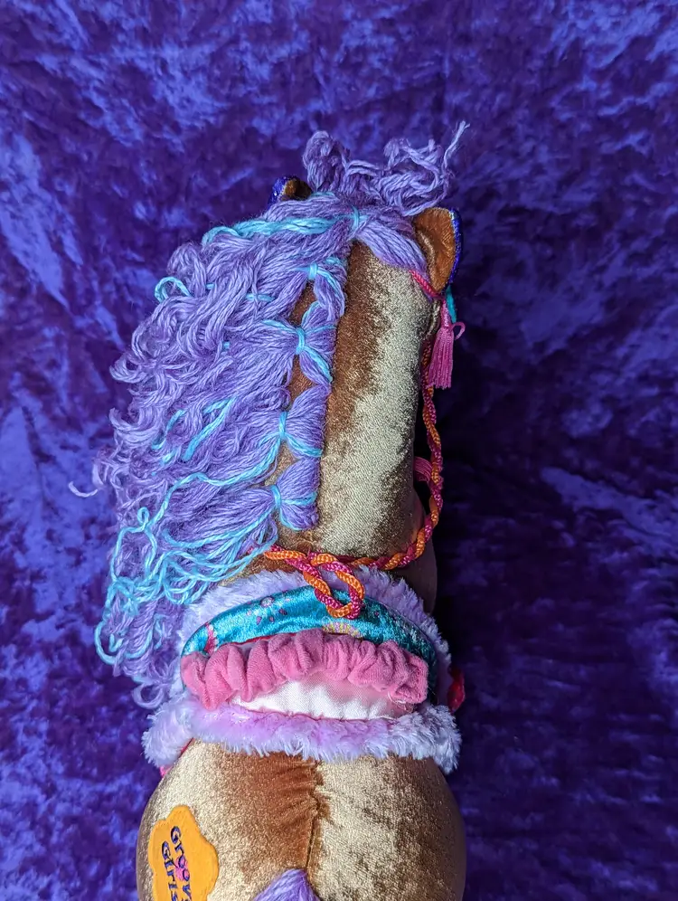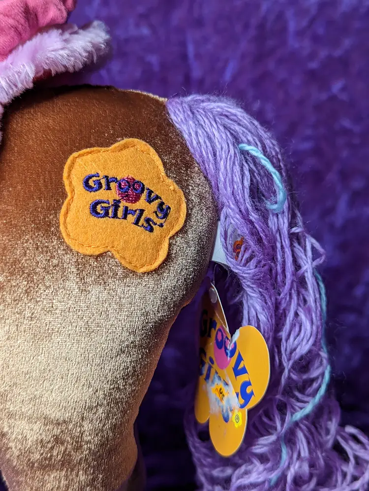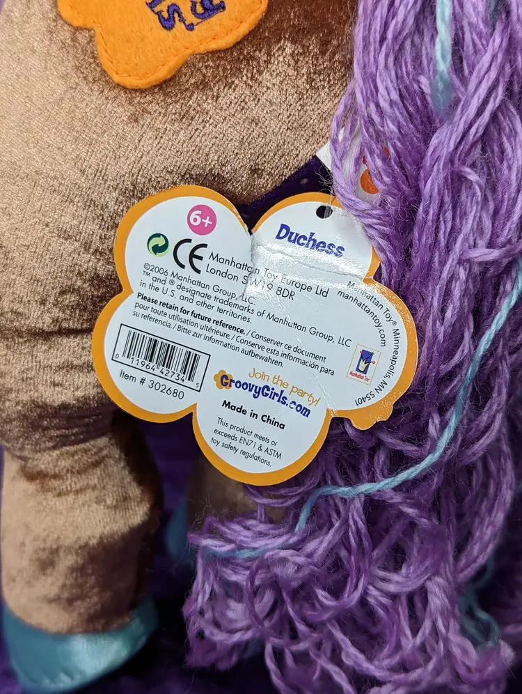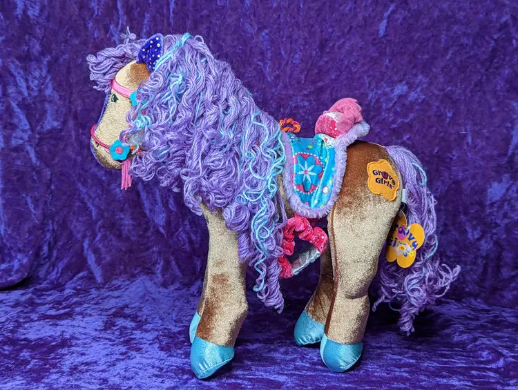 Groovy Girl's Brown Horse DUCHESS Plush with Purple & Blue hair. Stands just about 15" tall. Comes with original Tag & Saddle to hold groovy girl sized dolls.The sound does not WORK, Made in 2006