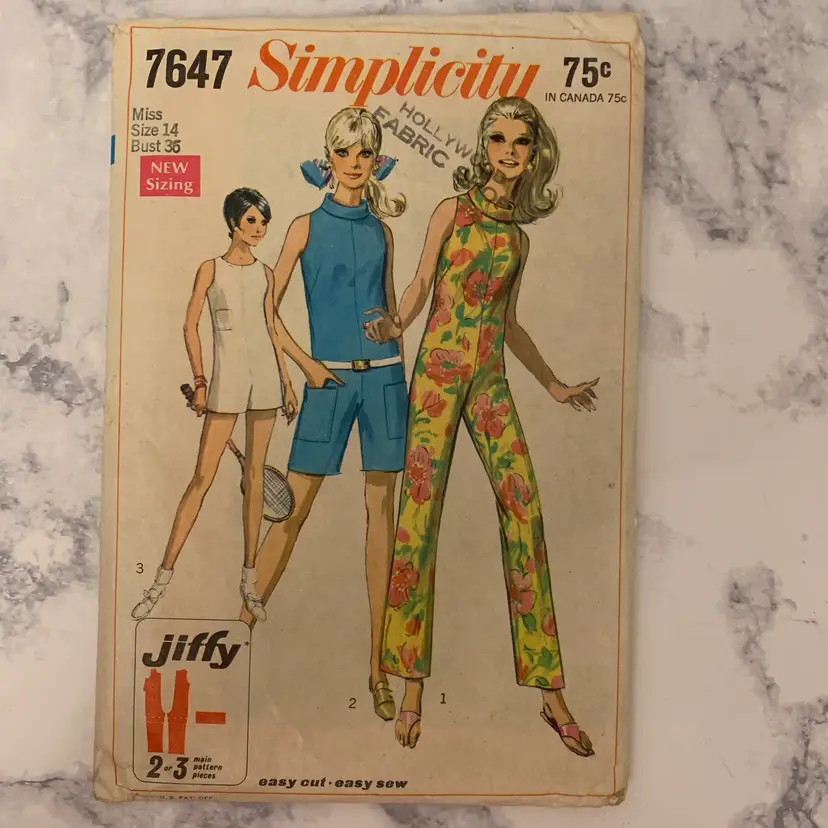 This Twiggy look jumpsuit pattern is a must for vintage clothes lovers. Jumpsuit comes in 2 lengths and a cute tennis outfit to boot. Size 14 in 1968 times but says new sizing. ? Pattern is uncut. Sleeve is in good condition and is a little wrinkled due to storage. One small tear under flap.