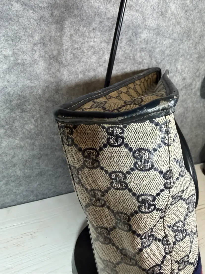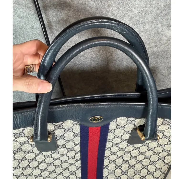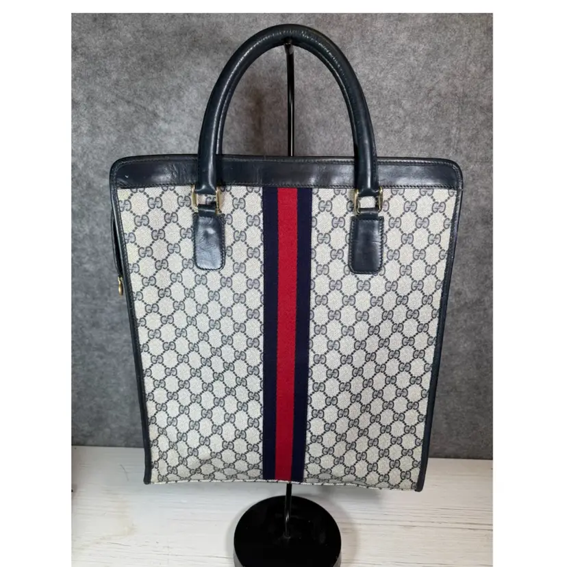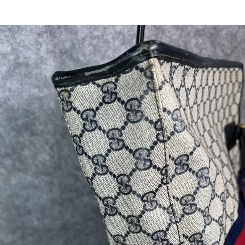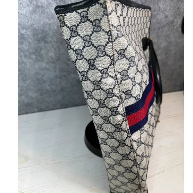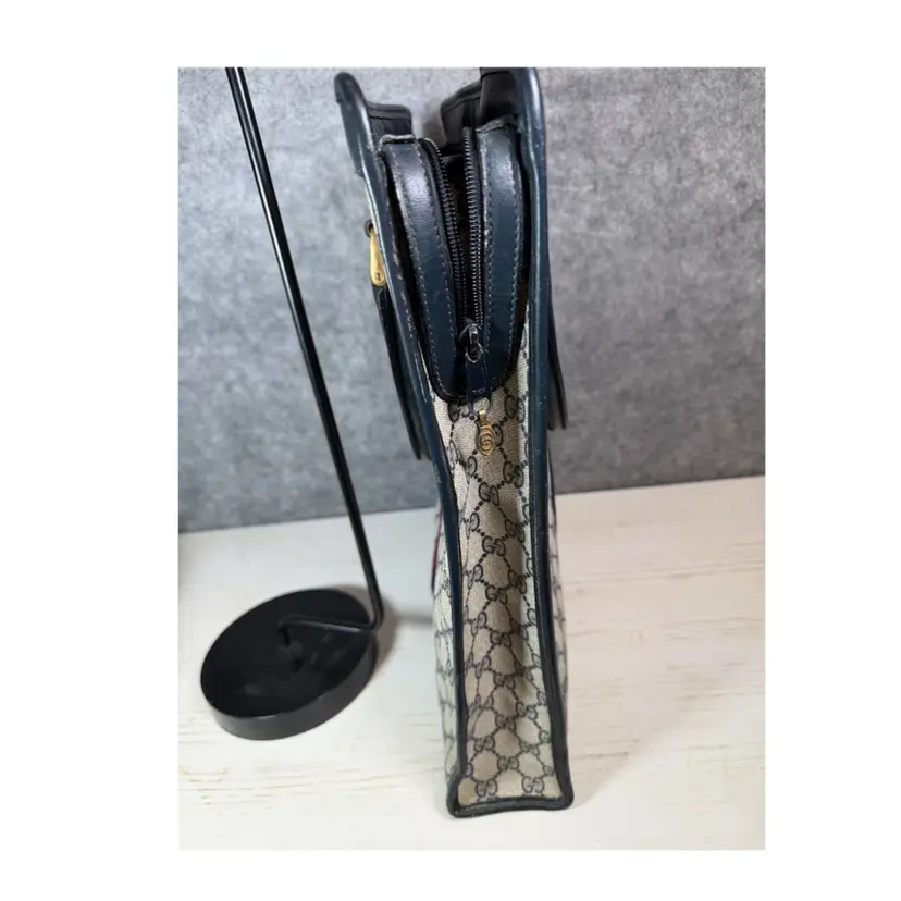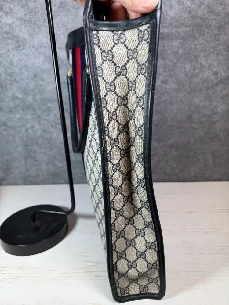 Details: • Brand: Gucci • Style: Structured tote / top-handle bag • Material: GG monogram canvas with leather trim • Color: Beige canvas, navy leather, red & navy web stripe • Closure: Top zipper • Interior: Fabric-lined with zip pocket • Hardware: Gold-tone • Made in Italy • Serial number present (see photos) • Zipper marked YKK