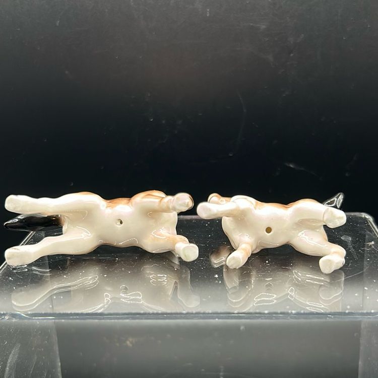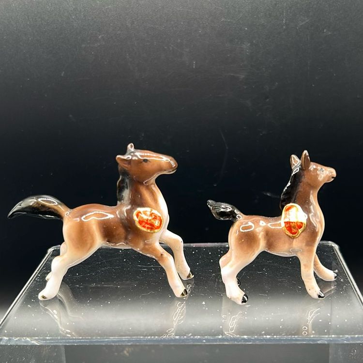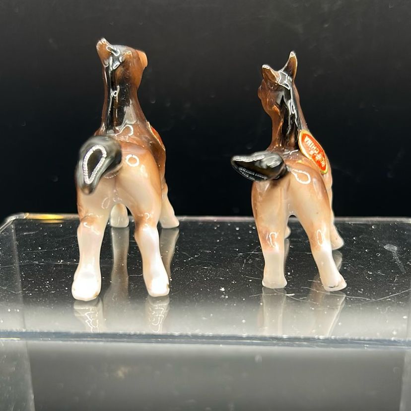 This item is a set of two vintage Hagan Renneker horse figurines. They are known as zilla and Filipino. They are made from bone China. A stand approximately 2 inches tall the widest one is at 2 1/2 inches the smaller, the one and three three-quarter inches in perfect condition. There are no chips or cracks.