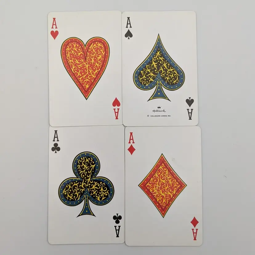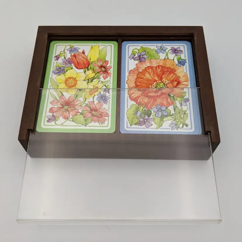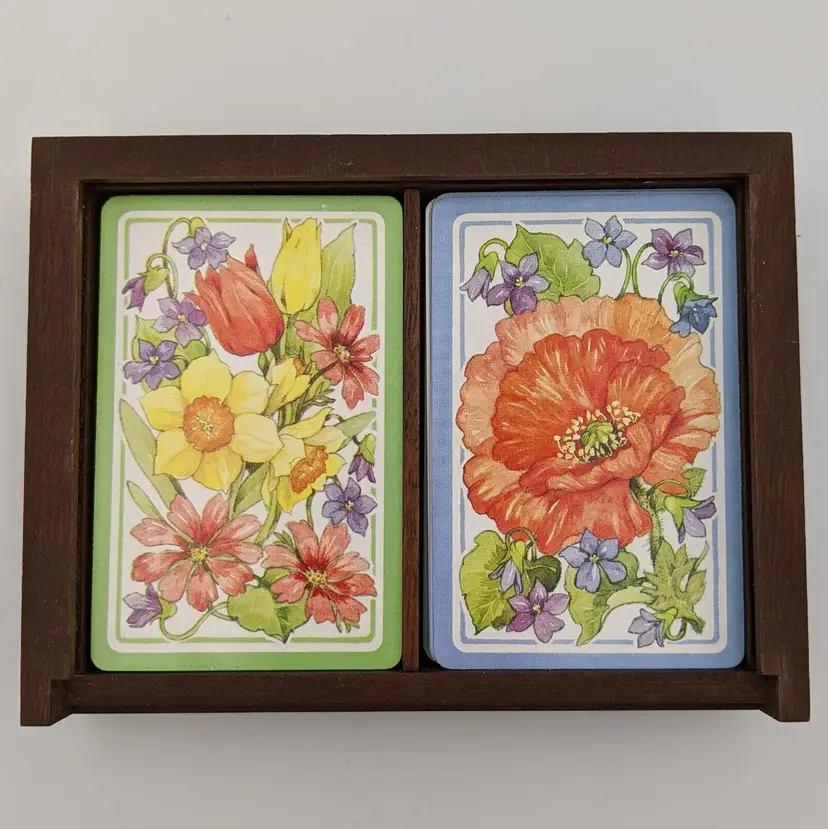 Each deck has 2 jokers. There are also Bridge rule cards included. Nice wooden box. Very nice condition. Brand: Hallmark Theme: Floral Featured Refinements: Vintage Playing Cards Country/Region of Manufacture: United States Age: Modern (1970-Now) Modified Item: No