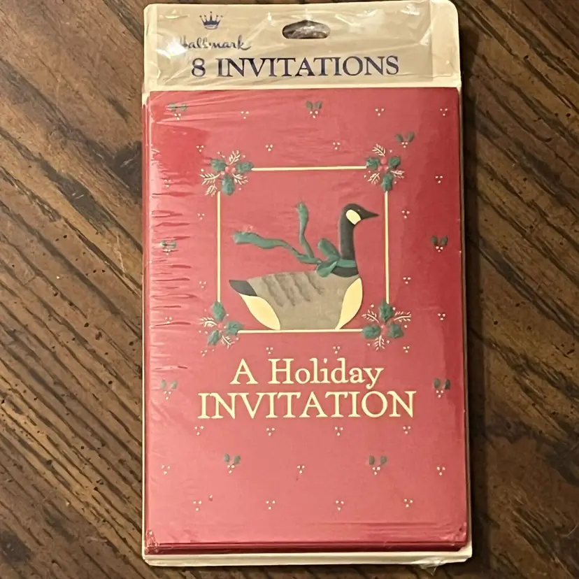 These Hallmark holiday invitations feature a charming goose design, set against a red background, perfect for seasonal gatherings. The cards come with pre-printed sections for date, time, and place, ensuring an organized event planning experience.