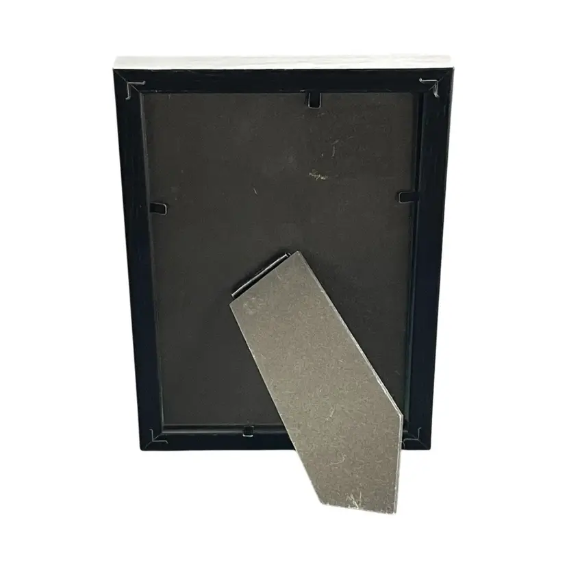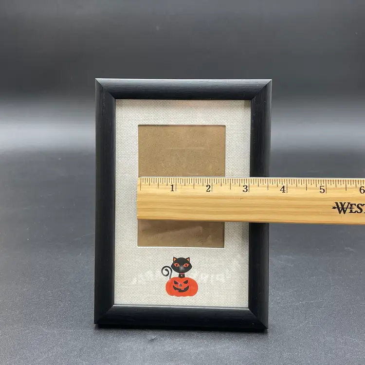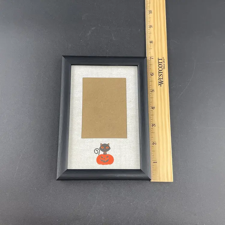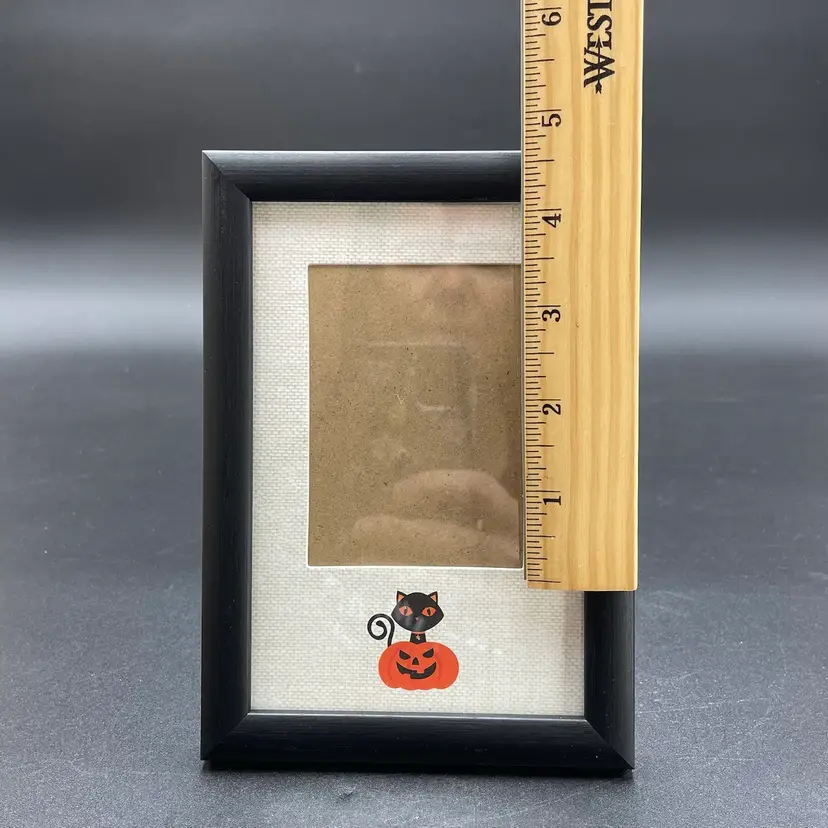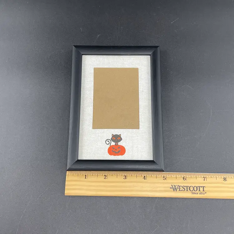 This is a Halloween themed picture frame featuring a black cat in a Jack O'Lantern. The entire frame measures approximately 7" tall x 5" wide. The picture insert measures approximately 3.5" long x 2.25" wide. No chips or cracks.