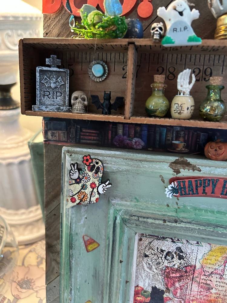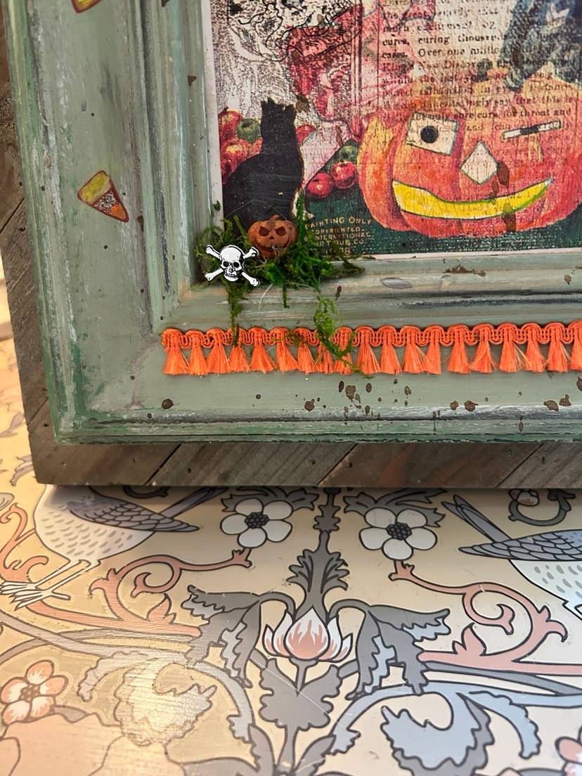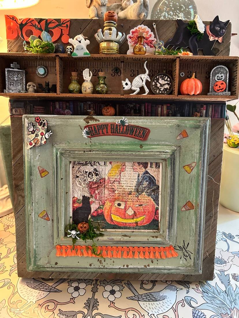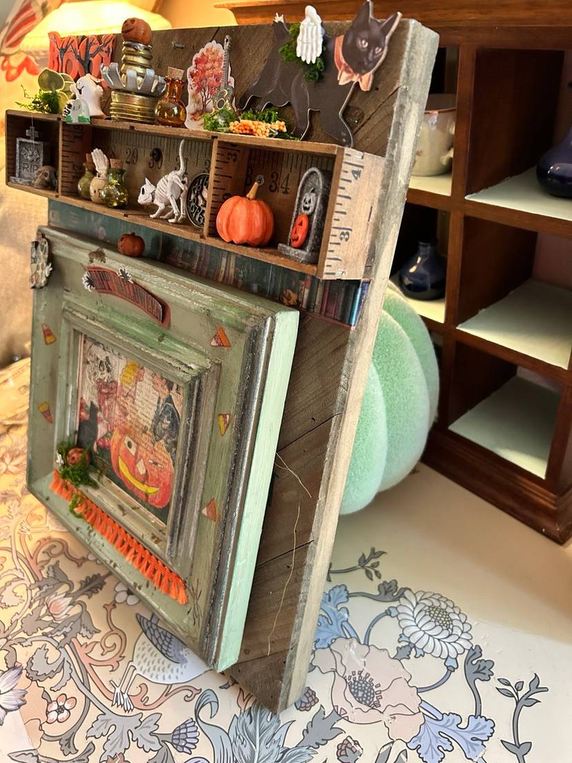 15x12". Created with Hobby Lobby wood backboard and vintage wood green frame. Many items are handmade, vintage and some contemporary. Ruler box is vintage. Hangs with rope as seen.