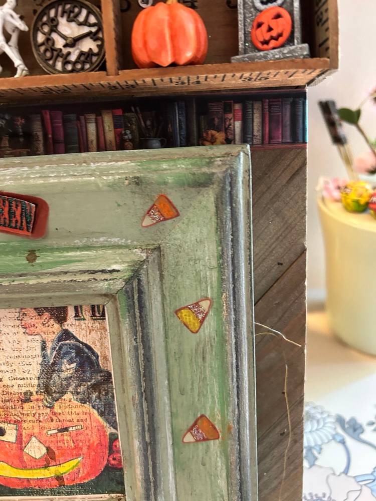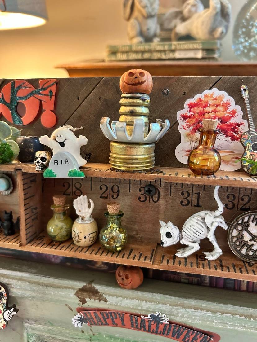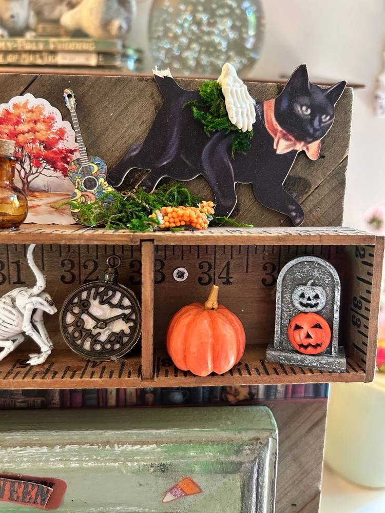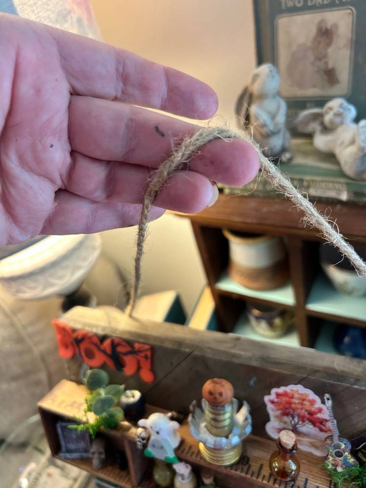 15x12". Created with Hobby Lobby wood backboard and vintage wood green frame. Many items are handmade, vintage and some contemporary. Ruler box is vintage. Hangs with rope as seen.