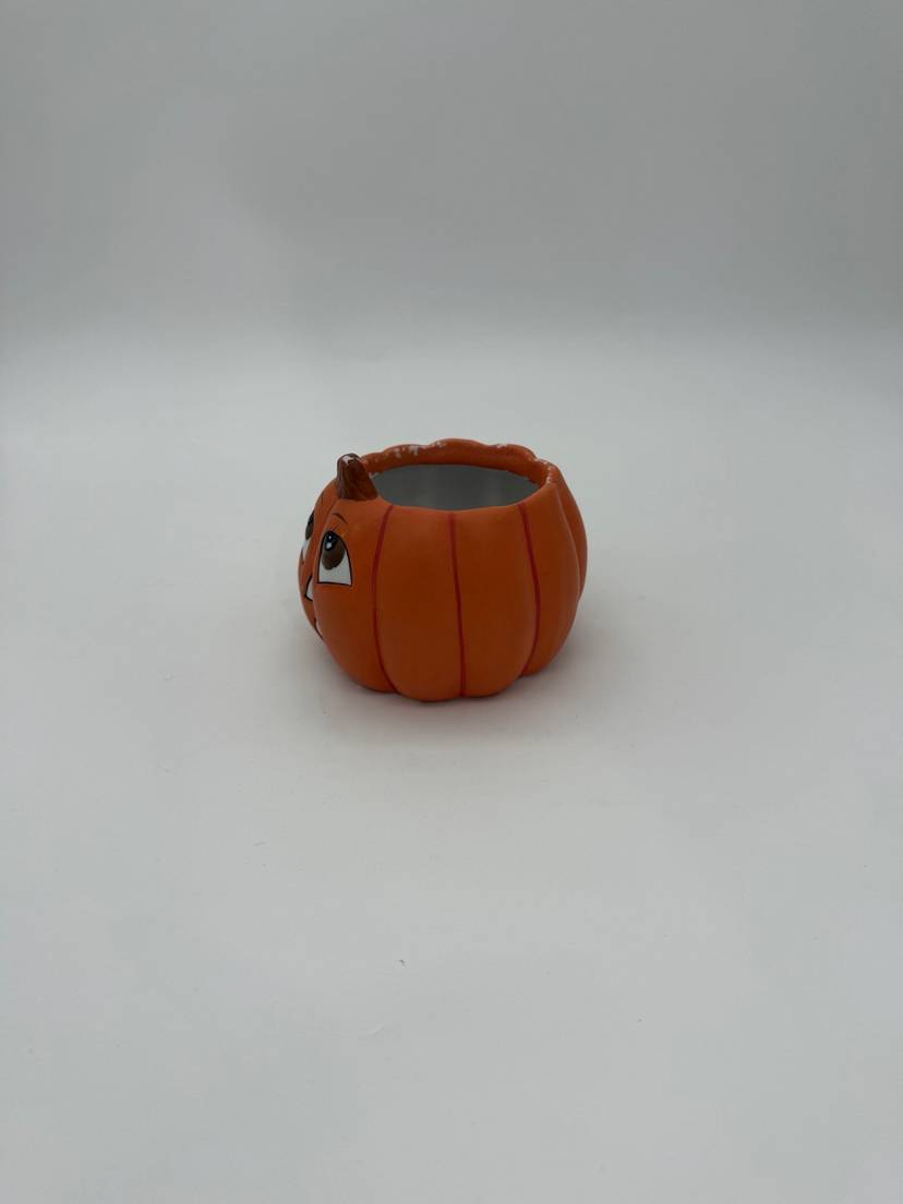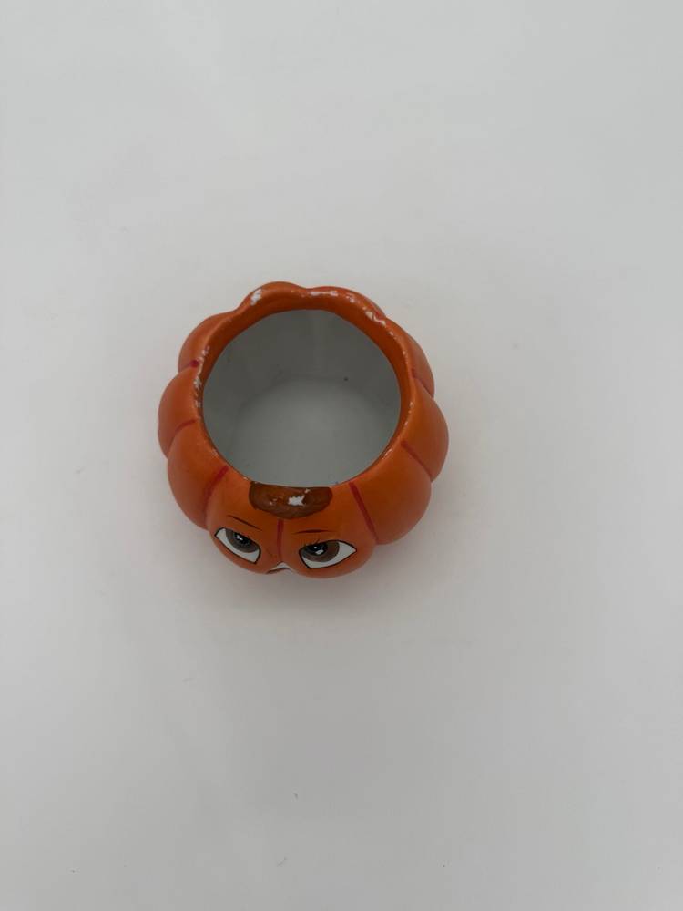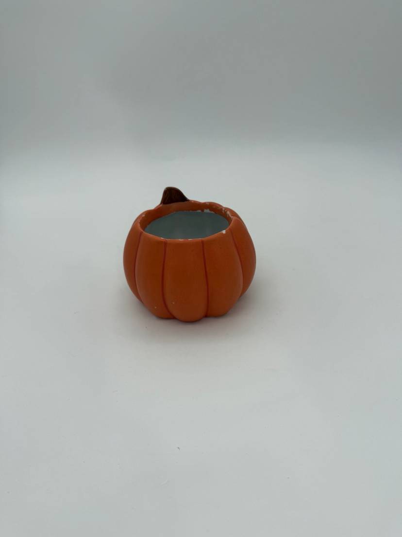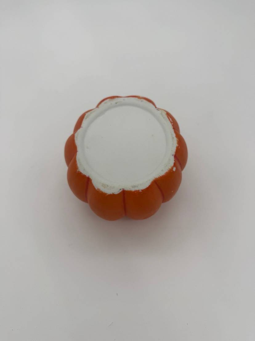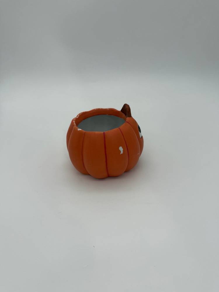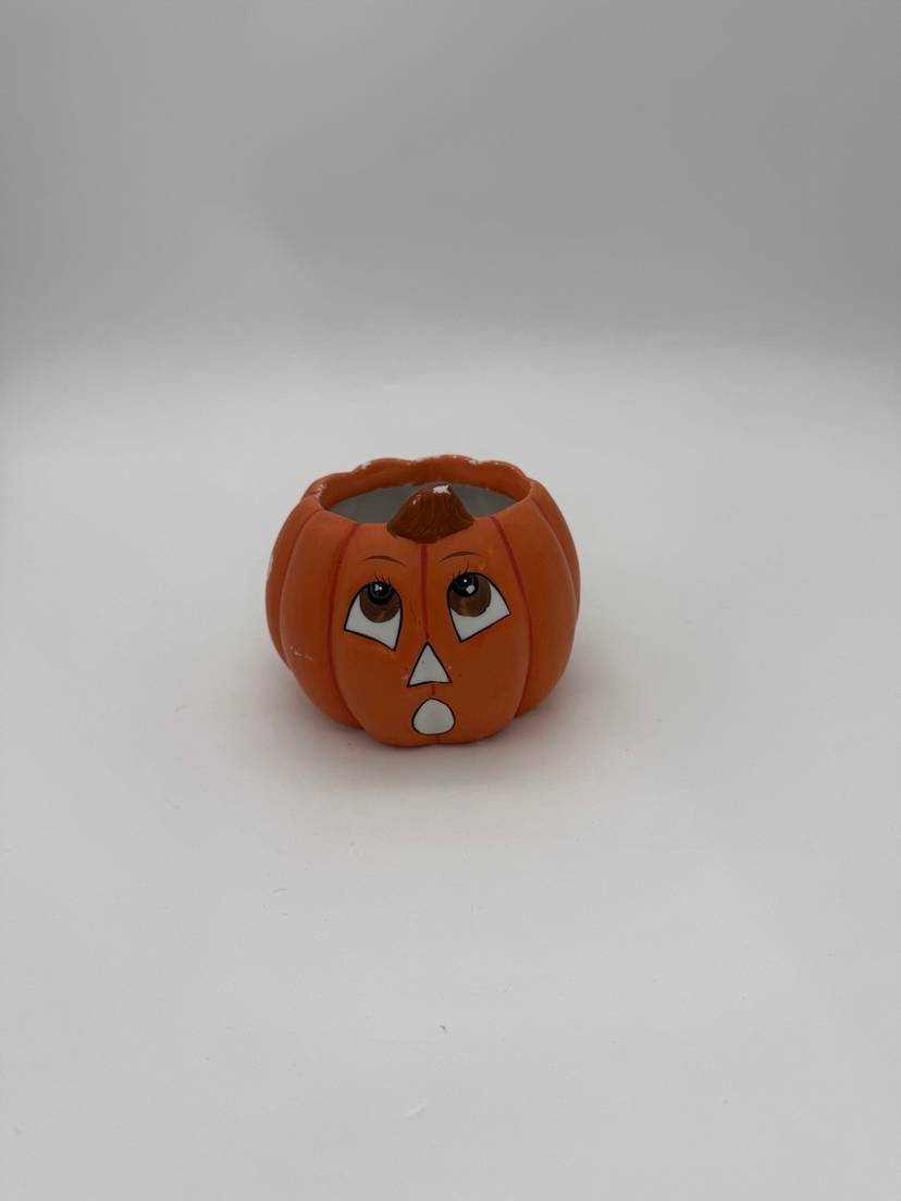 This Halloween fall decorative vintage hand-painted pumpkin Jack-O-Lantern planter is a small ceramic piece in an orange color, perfect for adding a festive touch to your home during the Halloween season. Its vintage style and retro design make it a charming addition to any room, from the office to the bedroom, and it can be used for multiple purposes for various settings and themes such as a planter, candle holder, or candy dish. With its easy-care instructions and compact size of 3" in height and 3.5" in width, this planter is a unique and versatile decor item for the autumn season. In very good condition for its age it does appear to have some faded paint in various areas, can be touched up if desired or kept as is for its original vintage appearance.